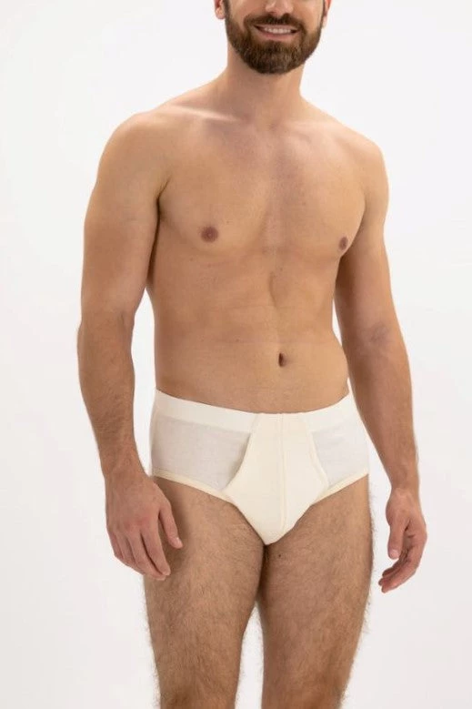 New arrival (hard-to-find item)! Men’s organic cotton briefs in Natural color with fully covered elastic waistband), made out of the softest organic cotton. Briefs are buttery soft and smooth and feature a fully functioning fly. The waistband is 1.2″ tall latex-free and fully covered in the same fabric.