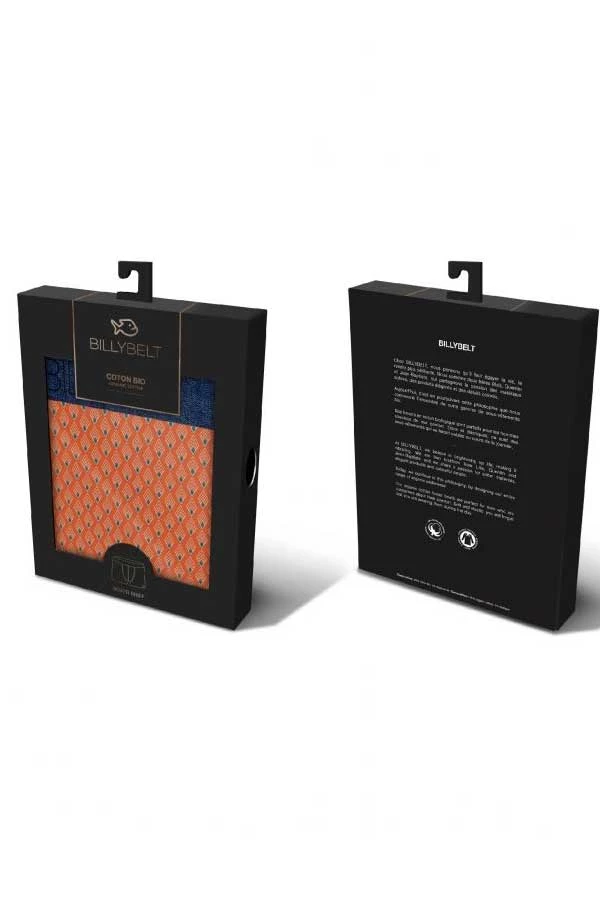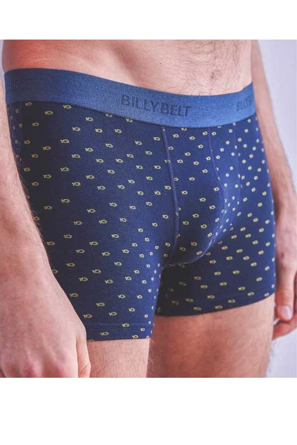 Men’s organic cotton jersey boxer briefs from far away in France with yellow fish detail on a navy background. Great styling and fit, modern fabrication, impeccable attention to detail. Briefs are navy background color with a small yellow fish pattern printed on. These organic boxer briefs feature 1.5″ comfortable waistband elastic in navy color, no functioning fly, fabric doubled at fly for comfort.