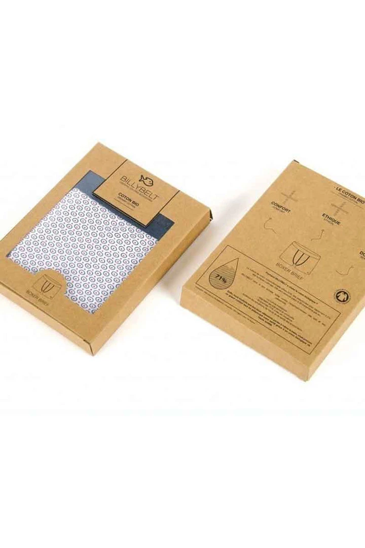 There is a small embroidered logo on the left thigh. A pair of these boxer briefs come in a recycled paper case.