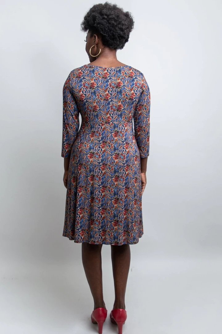 A flowy dress made of bamboo viscose is medium-weight, a pleasure to wear and it fits great. A picture of casual elegance, this dress has an empire waist and three gatherings off-center at the waist (gives great camouflage if needed for imperfections) and 3/4 length sleeves. A nice scoop neckline frames the face, the design is clean and simple with a beautiful flowy silhouette. Fabric provides great ventilation and stays cool in summer. It fits true to size.