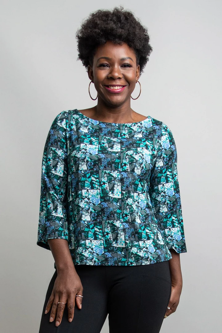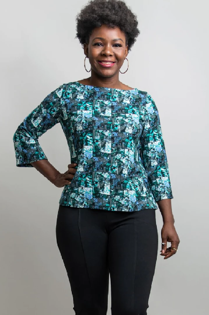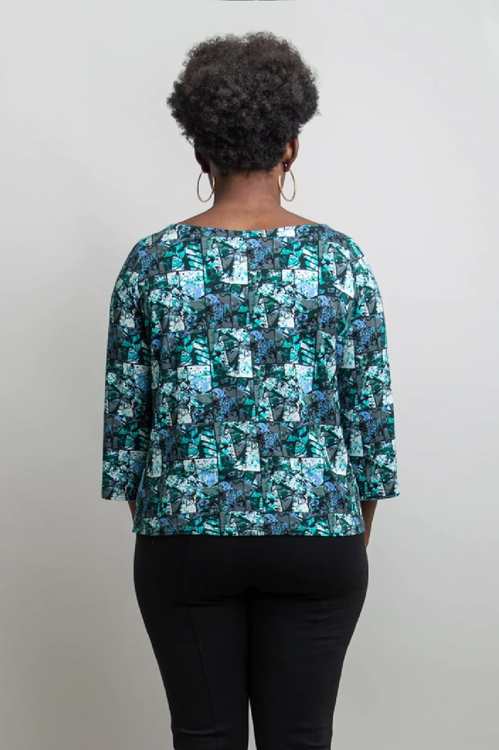 Nice lively top with a slight boat neckline, 3/4 sleeves top, and easy cut.  Bell-shaped sleeves, hem is just above the hip, allowing you to wear it with a variety of pants or skirts. Made of stretchy, cooling bamboo viscose fabric which provides great ventilation and stays cool in summer. It fits true to size.