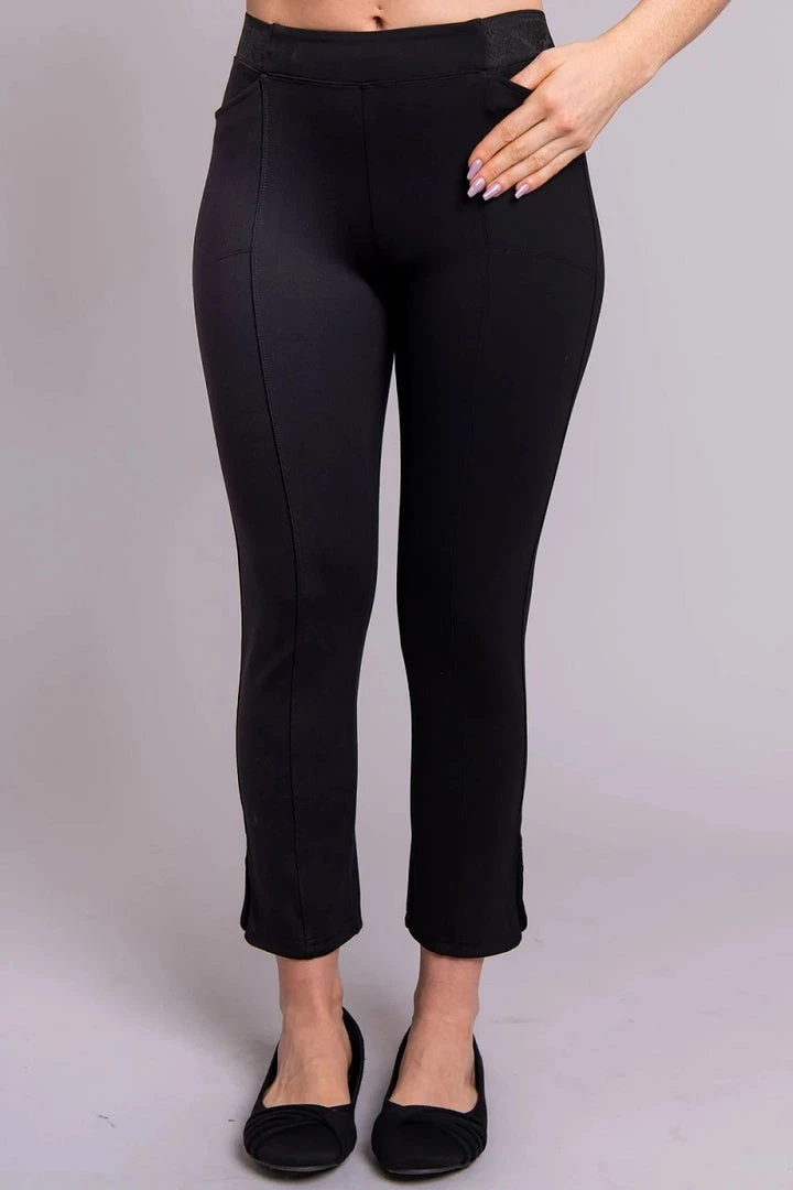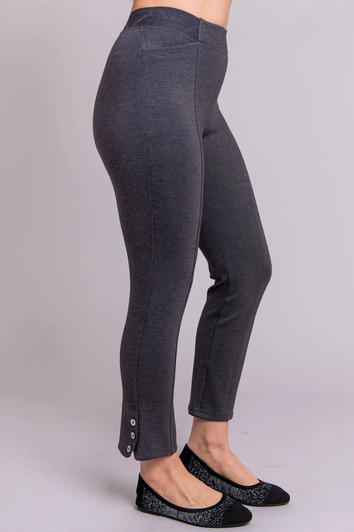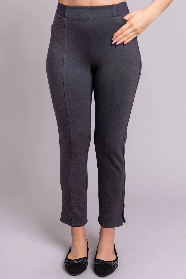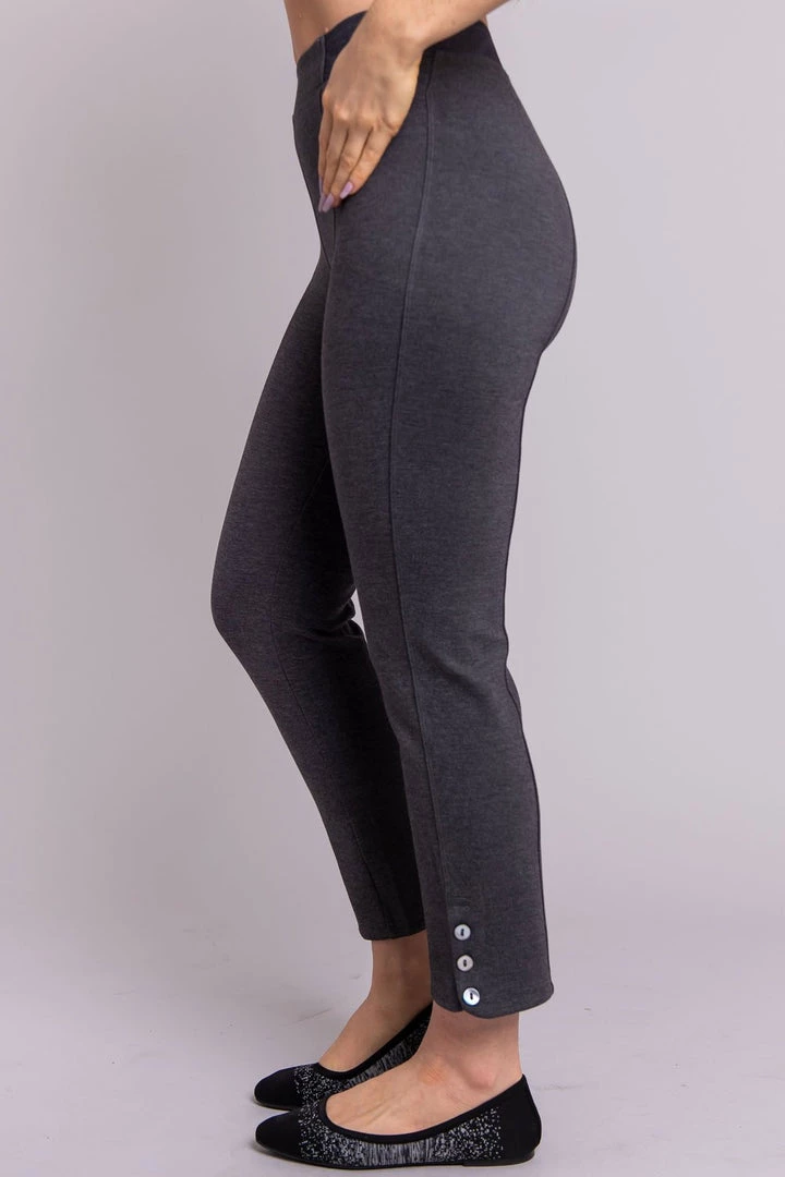 Great style pants, slim and right by your ankle length. Perfect for short booties, tall boots, or flats – these pants do look good! Flattering fit in natural, breathable fabric moves with the body. Easy pull-on style with 2″ decorative elastic at the waist. Vertical seams down the front and back add slimming emphasis. Two inset pockets at the front, a bit hidden but roomy, don’t add bulk. Three buttons on the bottom of the pant add flair.