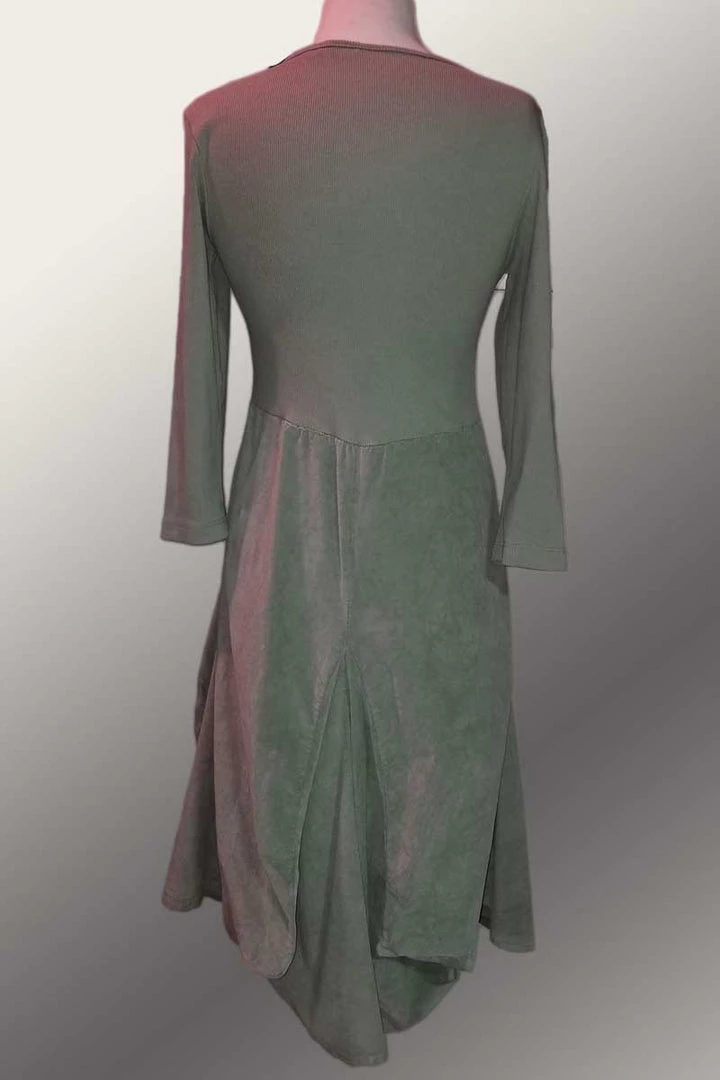 Corduroy version of our favorite Italian linen dress – with 3/4 sleeve. The cord texture is extremely tight do it feels like a smooth surface with a ribbed back, waist, and sleeves for a good fit. Very versatile and appropriate for most of seasons. The cord texture is incredibly fine with very little texture (see detail).