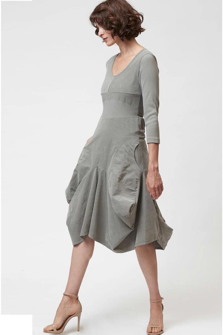 From Italian maker Inizio. The skirt portion has a gentle “puffed” style, with two generous pockets in front. Truly gorgeous dress, with simple but fun styling. It looks fantastic with any shoes or boots. Perfect!