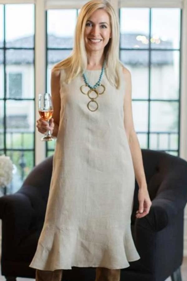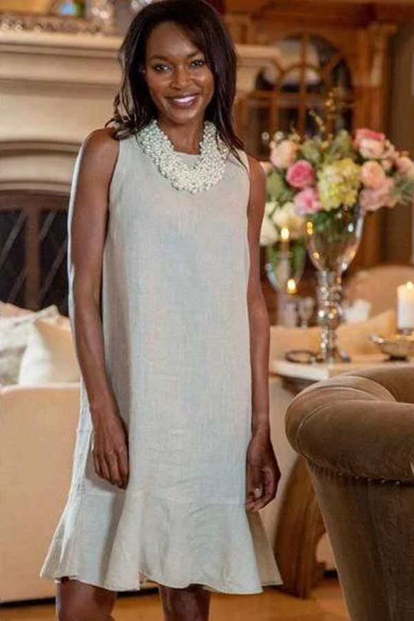 This flax knee-length tank dress is made with 100% washed linen. Beautiful sleeveless dress with fun ruffle at the bottom makes this a flirty and flattering dress. Easy to dress up with our specialty jewelry. Generous fit.