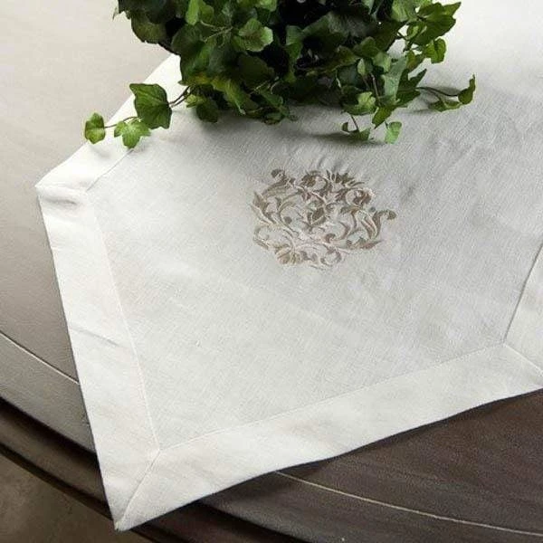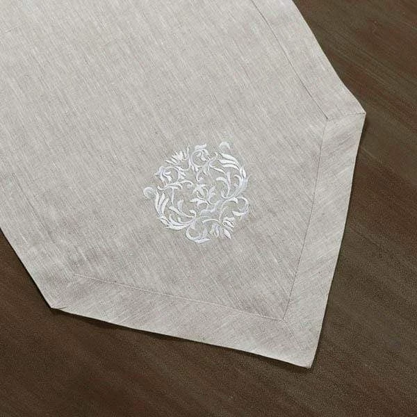Beautiful linen table runner with beautiful embroidery in complementing color. Finish off the look with our linen napkins (sold separately). Linen is best for a natural elegance.