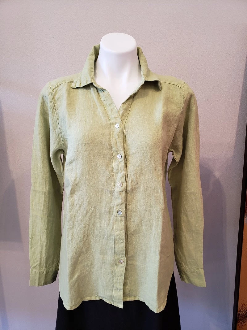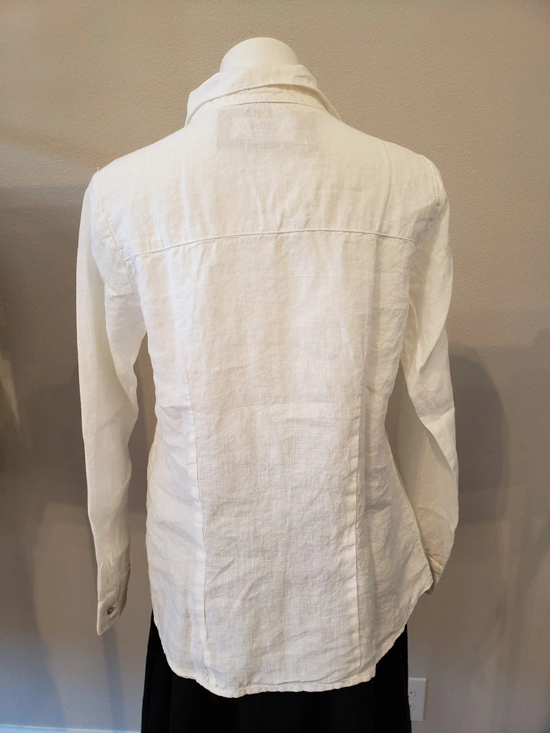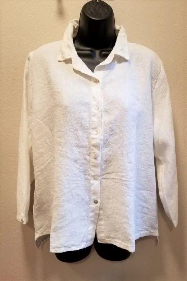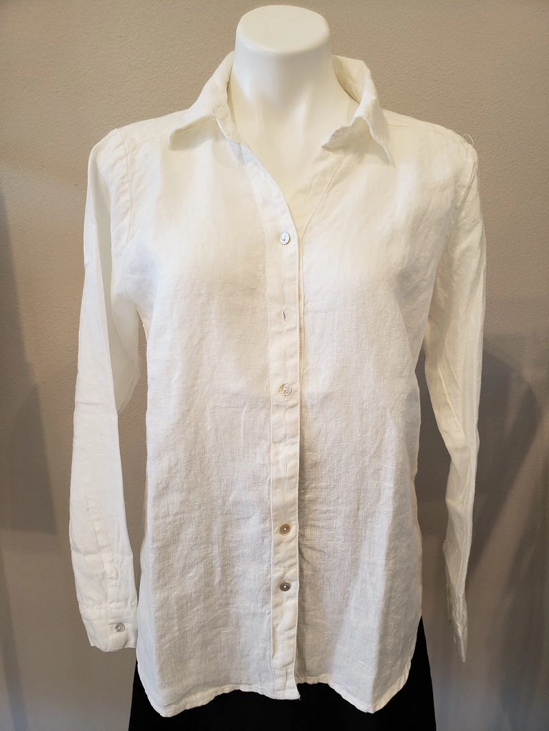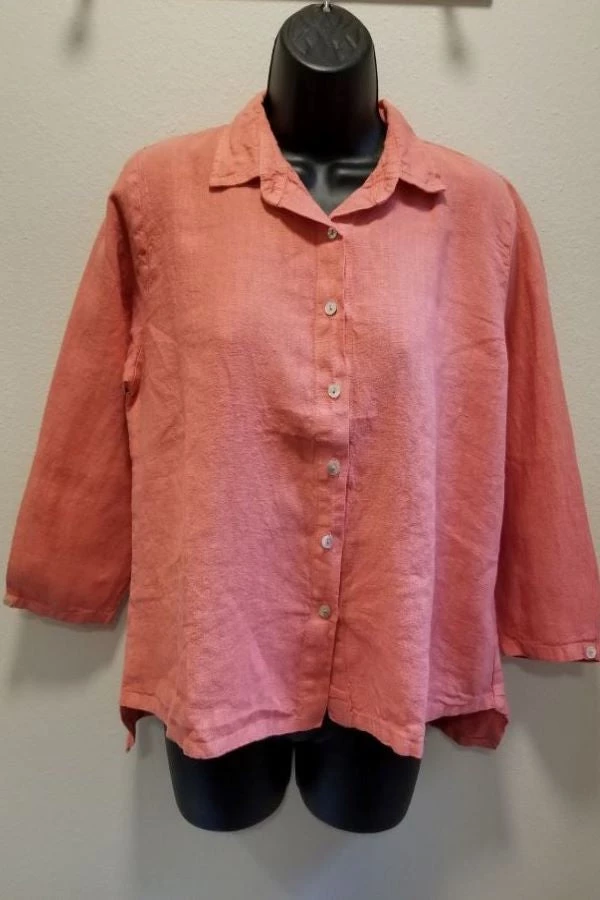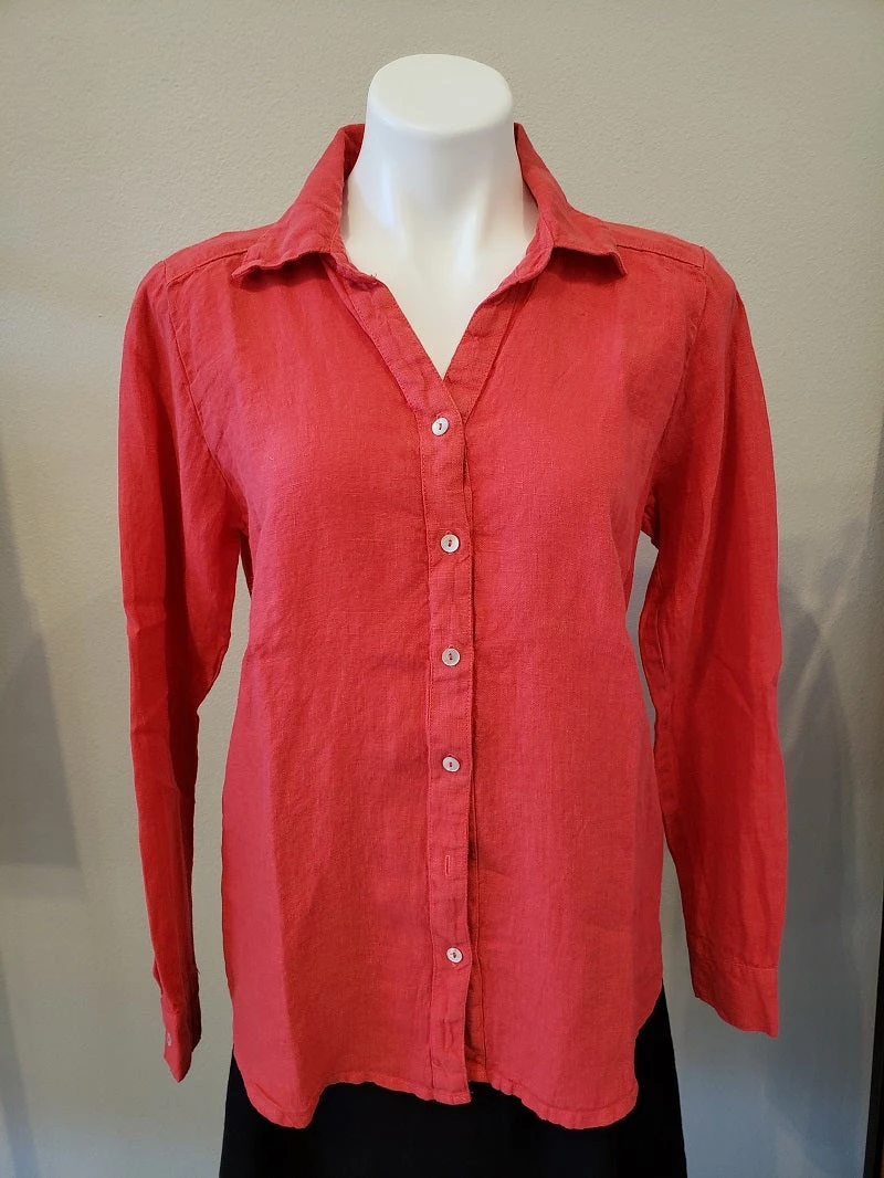 A great casual shirt made of substantially thick rugged linen. Made in the U.S.A. is easy, comfortable and well-cut with good sizing. 3/4 length sleeve (Picante, White) or full length (Harbor red) with a small button, button-down front. The top of the shirt has a slight V for Harbor red and a straight button-up for Picante and White. Perfect for any occasion.Â