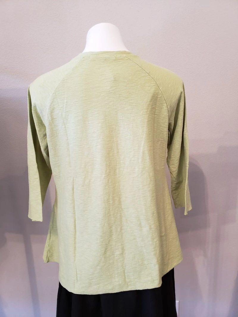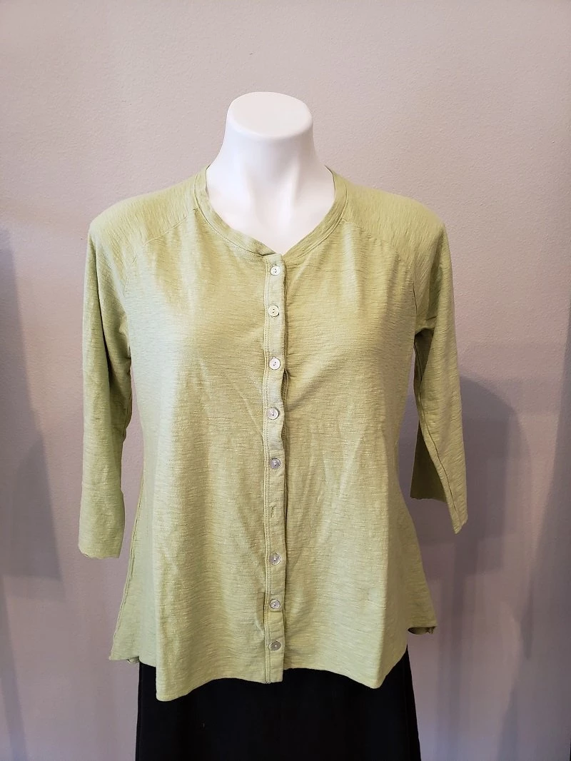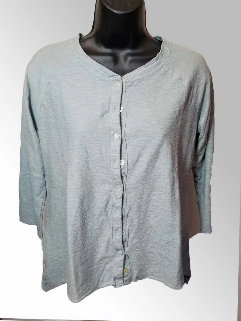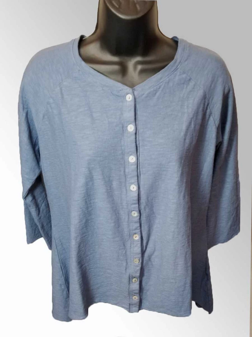 A casual, easy, lightweight cardigan. It can be worn as a cardigan or just as a shirt. It’s a great blend. The perfect length – falling just below the hips, also slightly longer in the back. Very denim friendly!