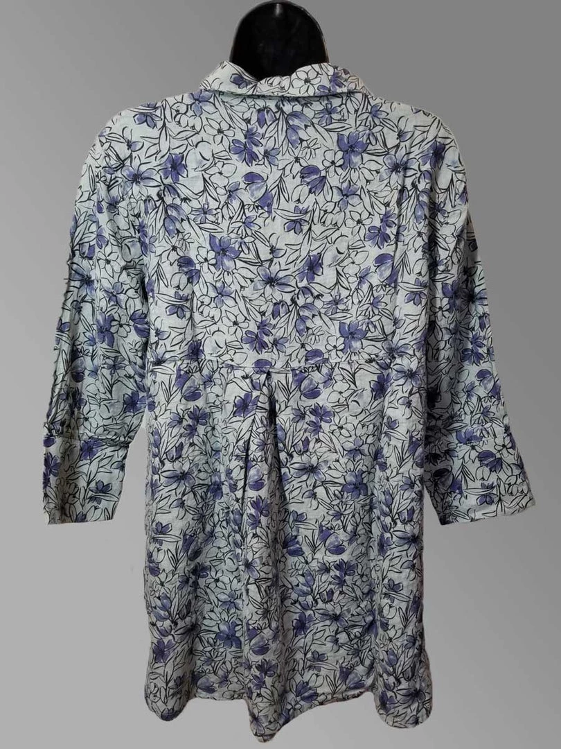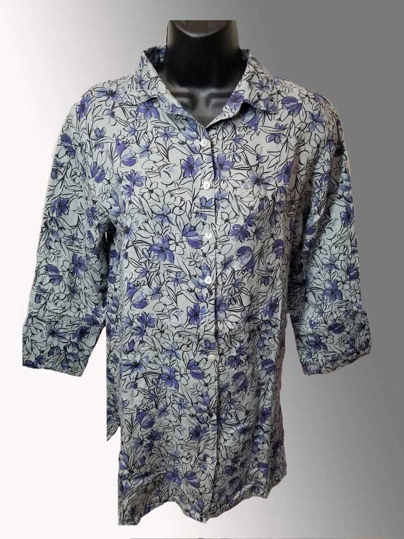 Another “easy” shirt that we all love! Casual, button-down with a collar and 3/4 length sleeves. It falls below the hips, with a slightly asymmetrical hem. Wear it as a shirt, or leave it open over a tank or tee for a lightweight jkt. Very comfortable and easy to wear.Â