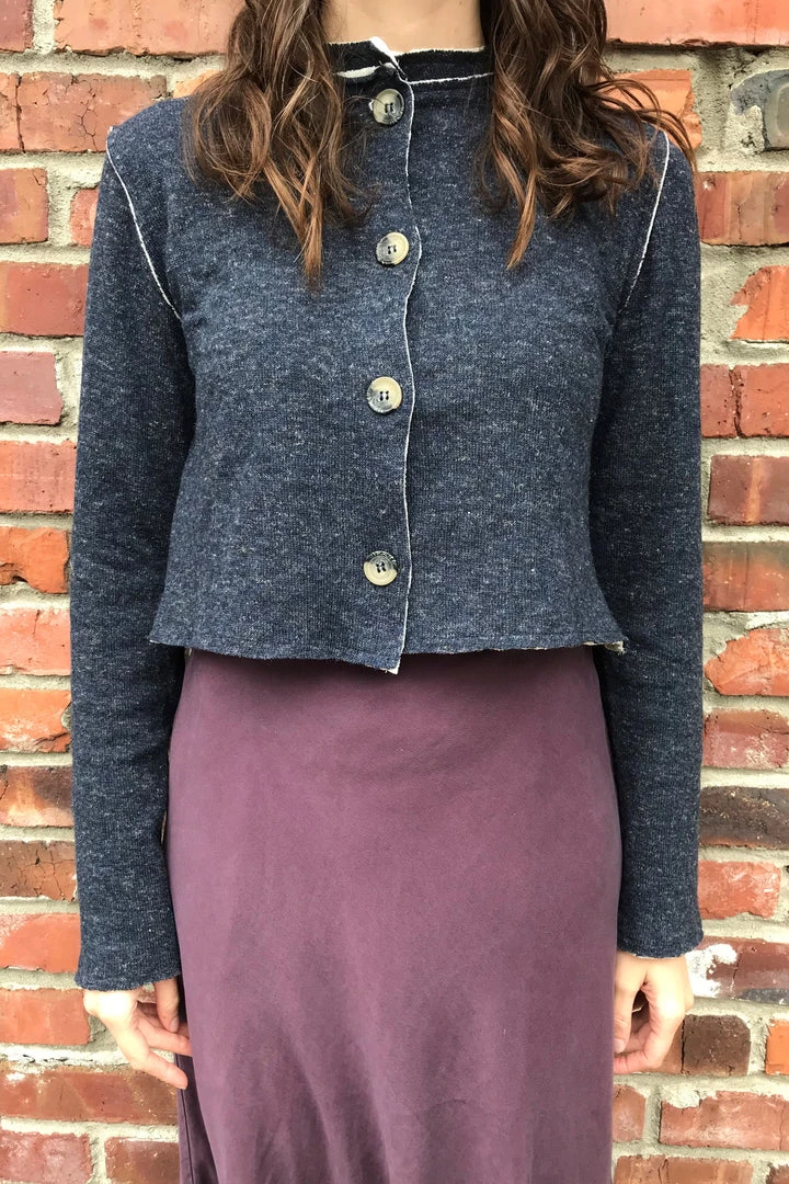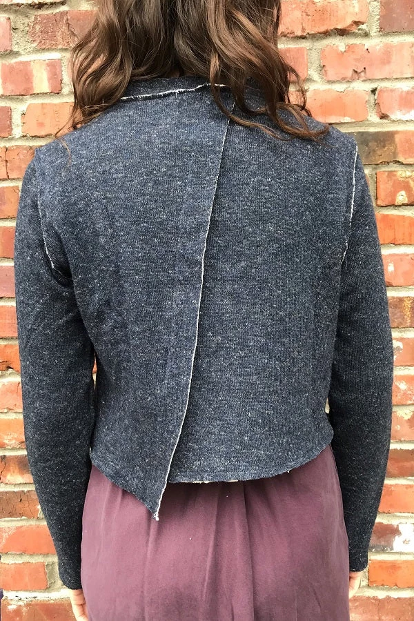 A cute, warm wool cardigan with some great styling details! Buttons and contrast trim. It’s a short boxy style with additional detailing in the back. Wear it by itself, or use it as a layering piece. It’s comfortable, easy and well cut with good sizing. Perfect for everyday life, whether staying home or going out.