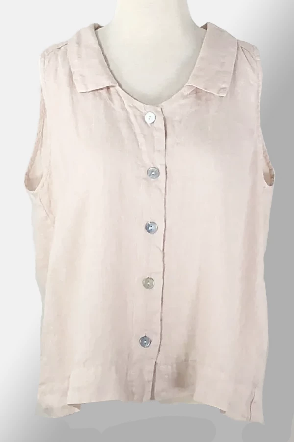 Sleeveless button-down blouse, made of very light woven linen. Beautiful collar and neckline, ample waist. Well-cut with good sizing. Can be worn as a vest as well. Perfect for everyday life, comfortable, soft, and healthy.ย