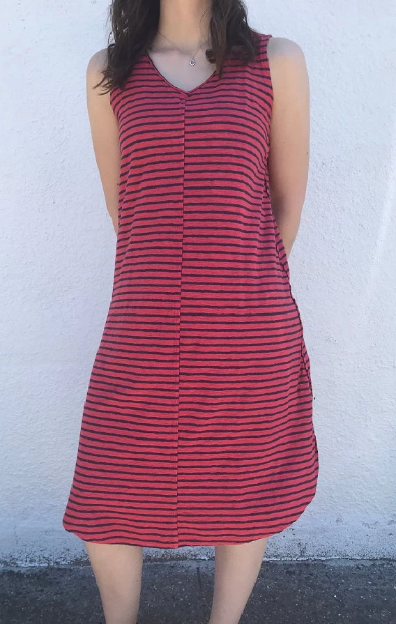 Our popular cotton and linen blend dress – perfect for all body types. Nice v-neckline, sleeveless and loose fit. Comfortable, not-too-long length.