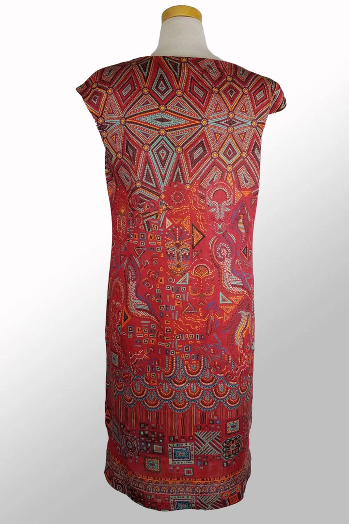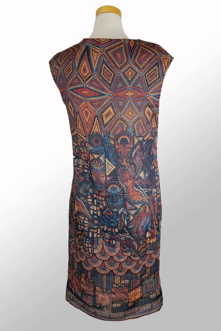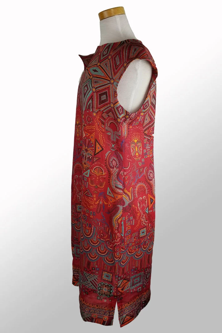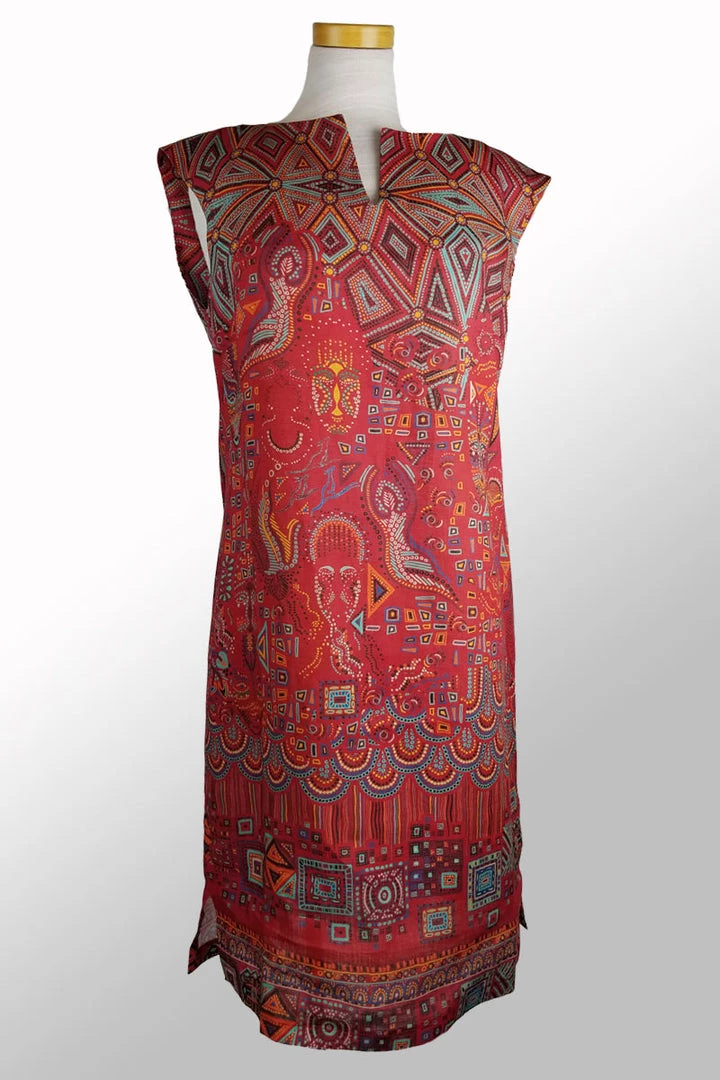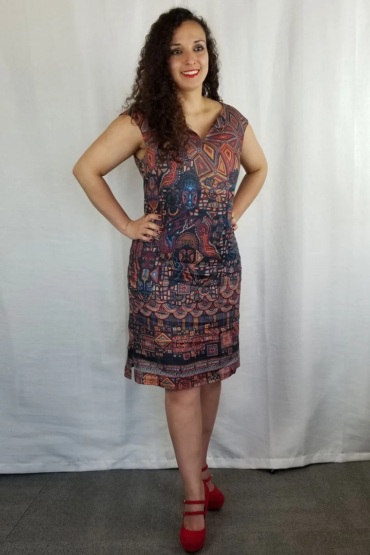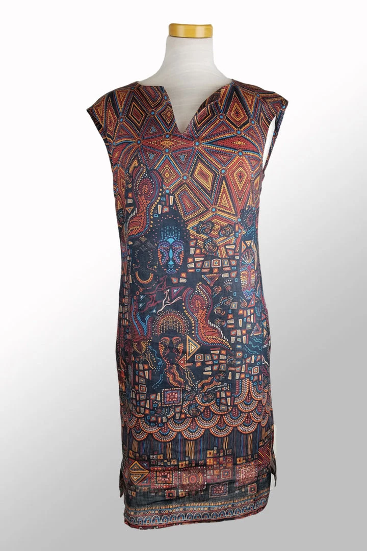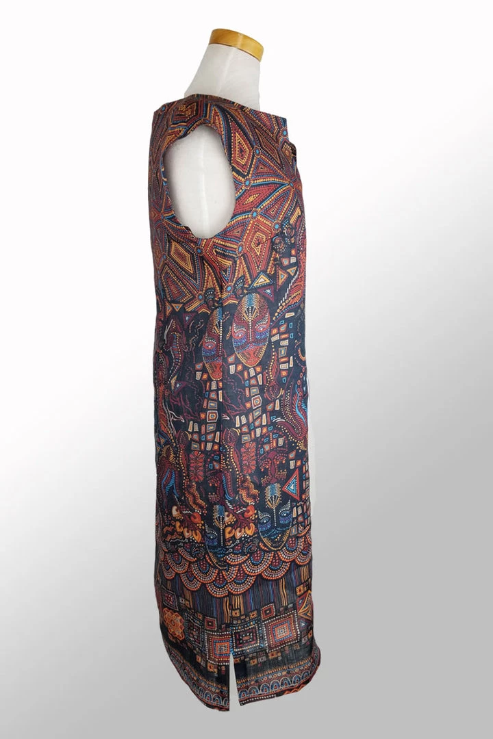 The dress is sleeveles and straight, opened at neckline, no pockets. It has a 4″ slit on both sides at the bottom, past the knee length. The simplicity and beautiful quality print makes it a really good asset for your wardrobe.