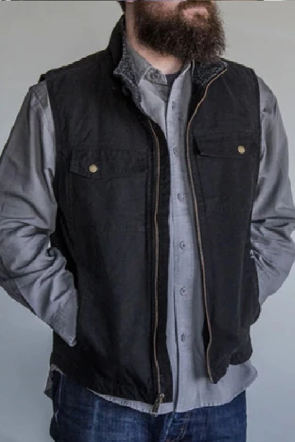 The body of the vest is a water-resistant and wind-resistant heavy-duty canvas. You will love the snow top poly sherpa-lined collar and back yoke.  Plenty of pockets to hold everything you need- large chest pockets with sturdy snaps, interior cell phone pocket for your valuables, and two vertical snap front pockets.  Quilted lining, durable heavy-duty triple stitching, heavy-duty metal zipper with easy grab pull.