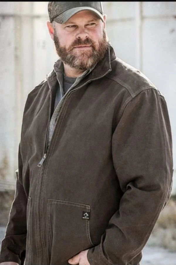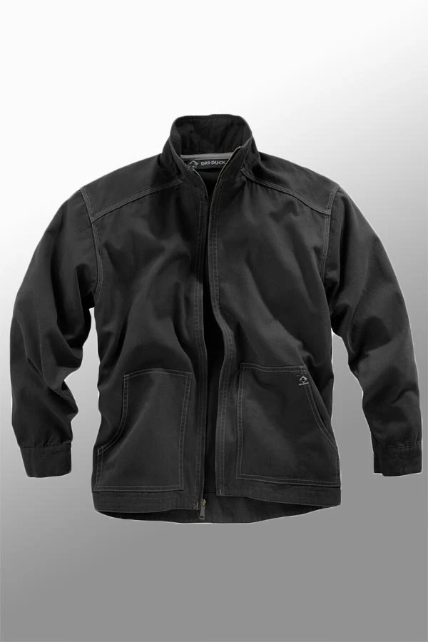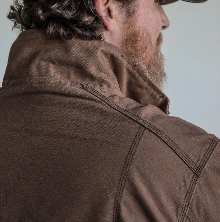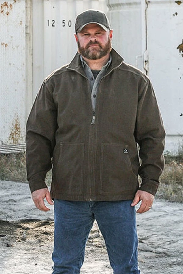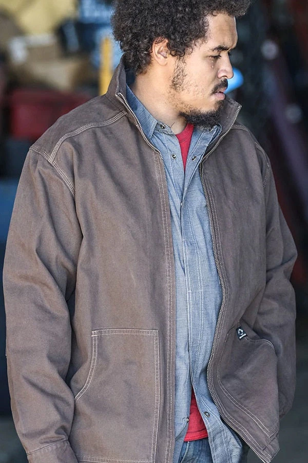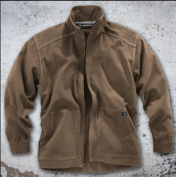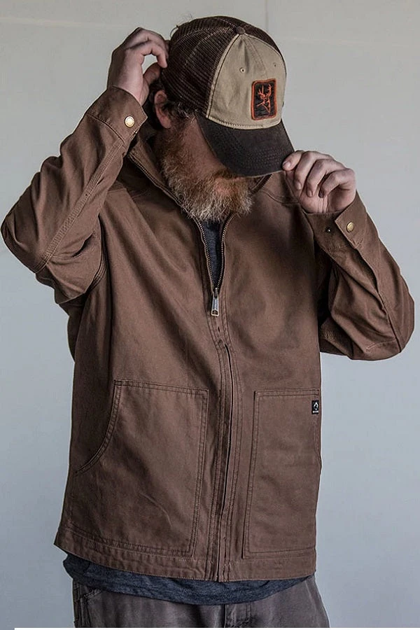 A hardworking canvas men’s jacket.  It’s lighter weight but still durable for three seasons. Nice enough to wear for an evening out and hard-working enough for heavy-duty use. Unlined and uncomplicated, this rugged jacket is comfortable and good-looking.