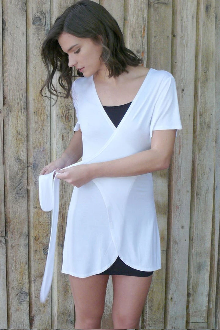 A beautiful light robe for when you just need a bit of cover-up, great to walk to the pool or lounge in the evening. Wrap-around style is easy and comfortable. The fabric feels like silk, super nice to the skin, this robe is light and feminine. You can play with a waist tie for varied effects. The robe is very gentle on the skin, soft and luxurious.