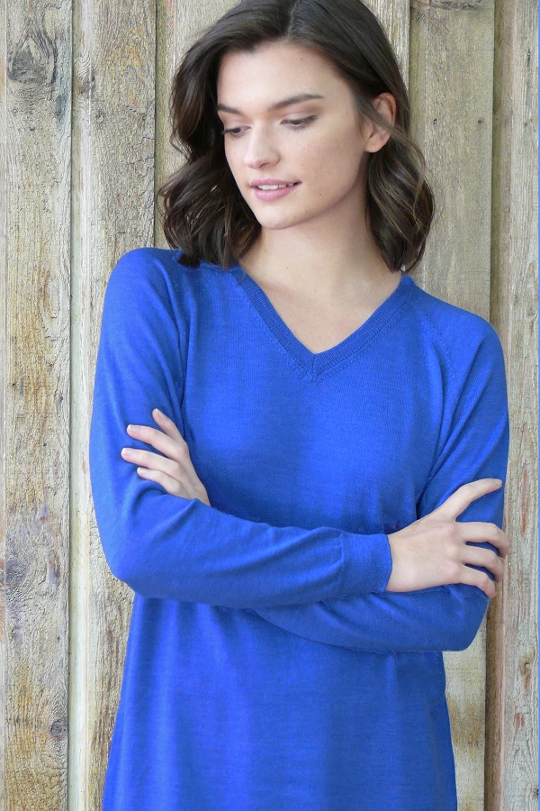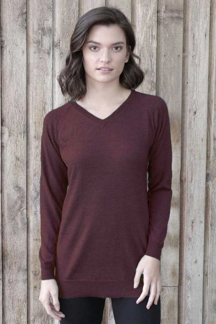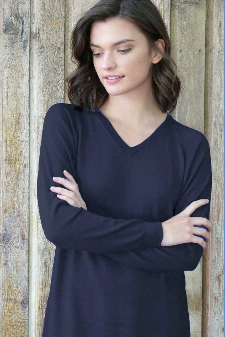 Timeless Merino eco-wool sweater with clean lines and flattering V-neck. Mid-thigh length hits just right to look best, with a nice generous fit. 2″ ribbing at sleeves and 2.5″ at the bottom give a classic feel. Raglan sleeves give good comfort for movement. The finish is very high quality, smooth and soft, it looks double the price. A truly good buy – goes with a short skirt, long skirt, skinnies, and leggings.