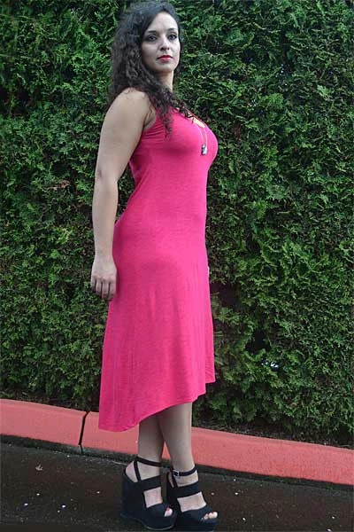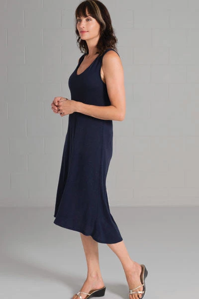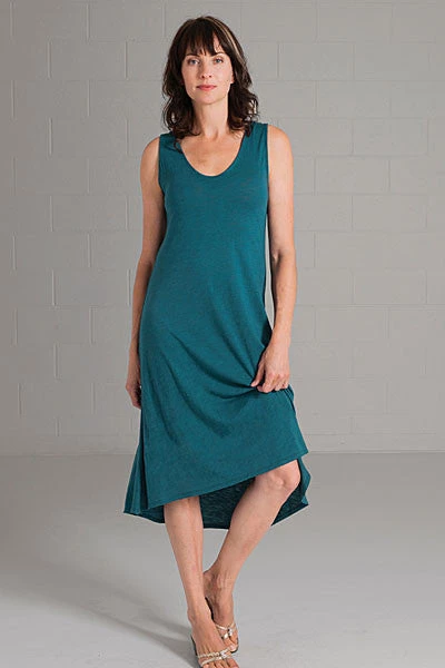A beautiful blend of textile (bamboo viscose and organic cotton) in this perfect summer dress. Back hem is slightly longer, nice finish around neck and armholes, wide shoulder straps. The fabric is very light and breezy but it has weight so it drapes well. Perfect to take on vacation. Nice longer length.