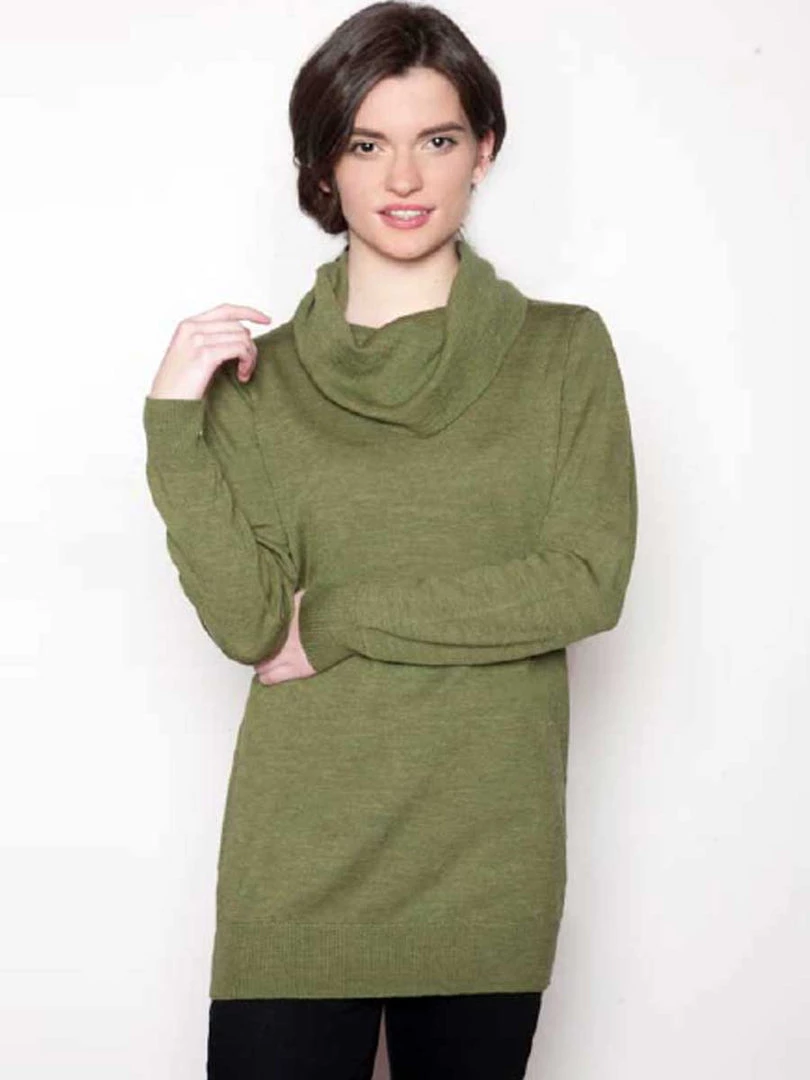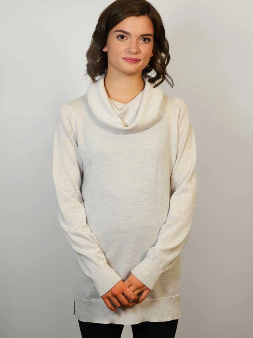 A classic Merino wool cowl sweater, great for professional or casual life. Longer length, generous cowl neck, clean finished hemlines. Great with jeans, skinnies, leggings or pencil skirt. Made of soft merino wool, which makes it hang fluidly on the body and has a classic fit. Aslit on the sides.