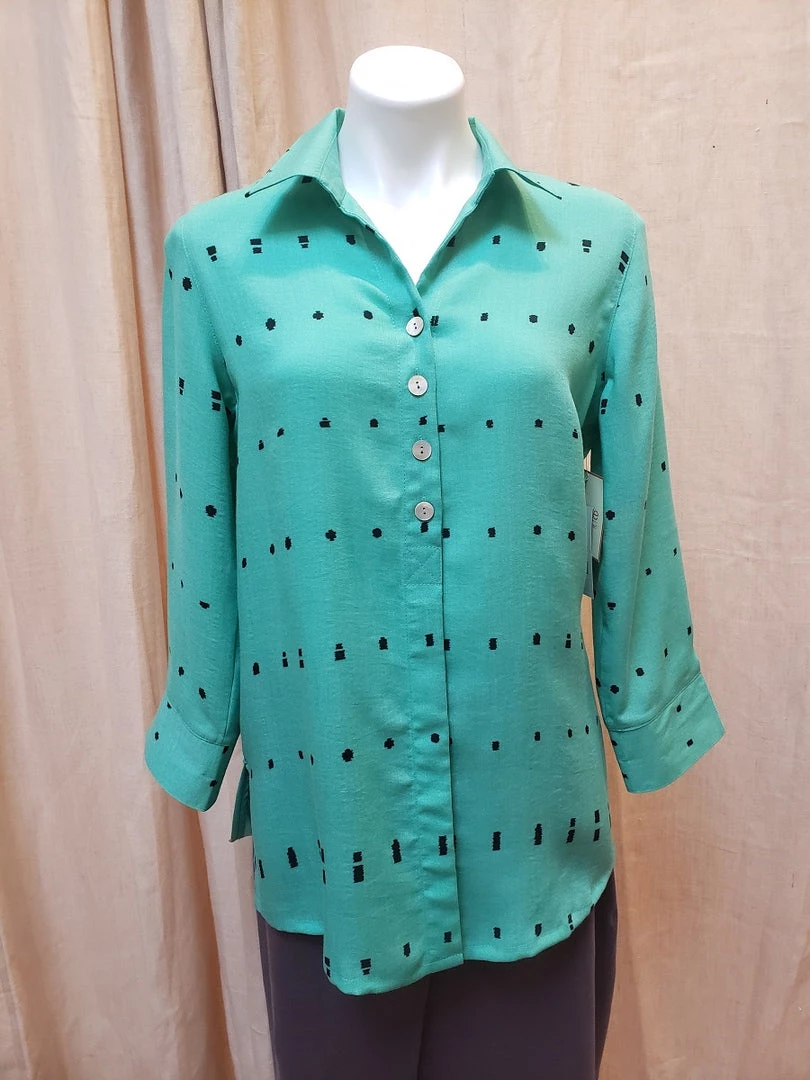 This is a beautiful wrinkle-resistant 3/4 sleeve button-down top.  Each top is hand cut and precision tailored by master tailors. Dress it up for a night out or pair with jeans for a casual day shopping with friends. Wear it as a top or as a lightweight coat. The sleeves roll back making it perfect for any time of year. Â