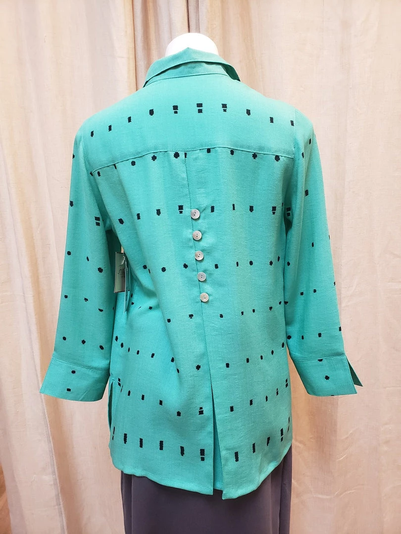 Features wrinkle-resistant linen.  Fridaze uses two to three times higher thread count than other linen on the market. Each piece is pre-washed and pre-shrunk to hold the color and shape. French seams are lined with sleek satin bias tape for a polished finish. Hidden inner buttons on the bottom half, sleek slit cuffs on the arms and custom tailoring throughout. The decorative buttons and inverted pleat on the back are an elegant touch.  Pale green with small decorative black shapes throughout the top. Â