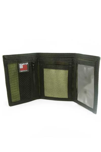 Tri-fold hemp wallet, in solid color. Slim but strong and functional, this wallet has a 100% hemp shell. Â Inside there is a zipped section, plastic ID holder and a cash pocket through the length. Great gift idea.