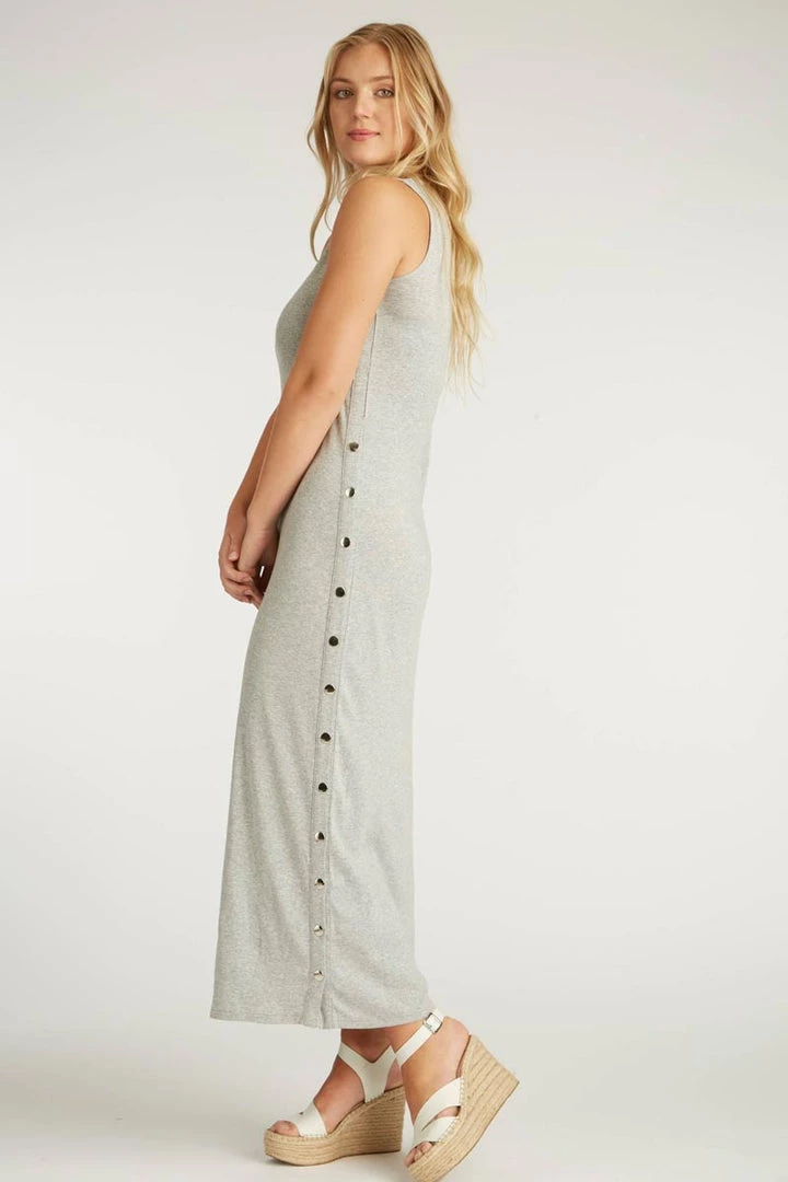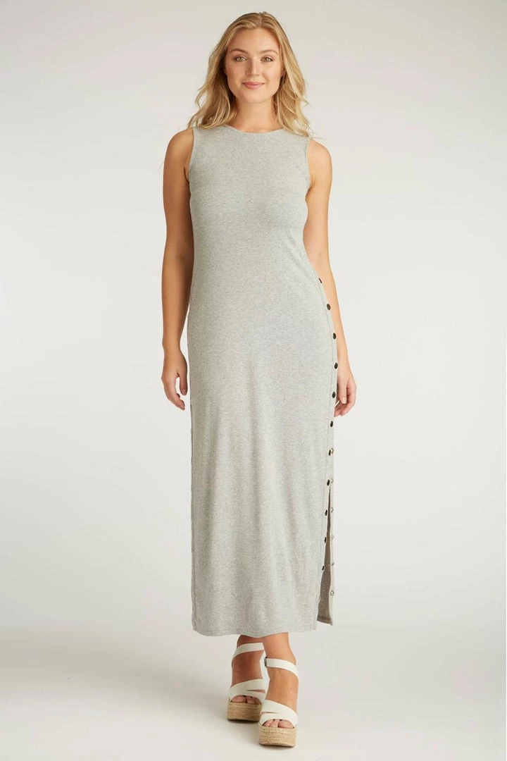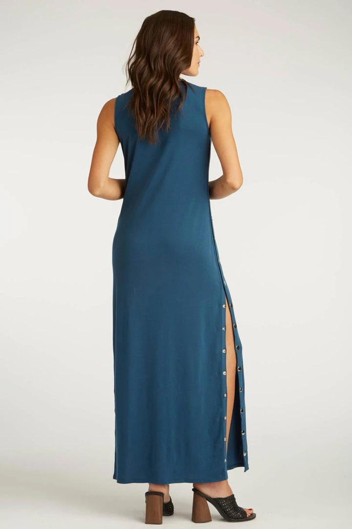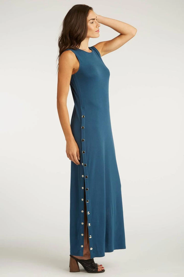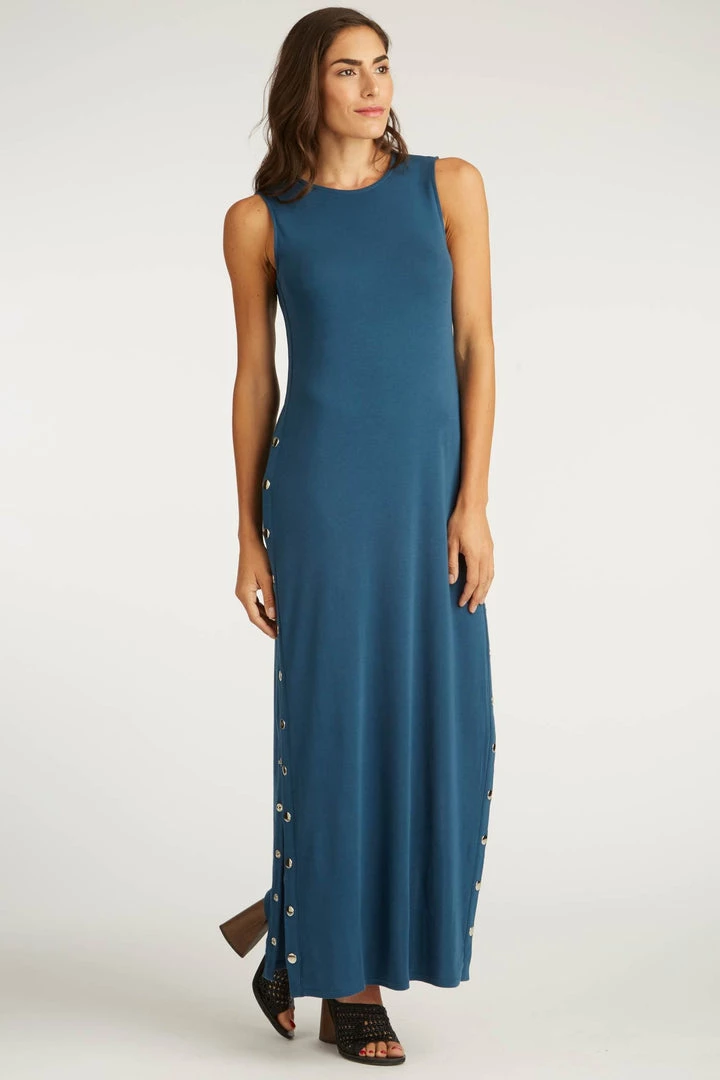 Beautiful flowing long maxi dress made of cloud-soft certified organic Pima cotton. Fair Trade artisans work put together the most luxurious, soft, flowy garment. Ankle-length dress has a long snapped section with silver metal snaps on the sides that lets you choose the height of the side opening. Gentle crew neckline, sleeveless.