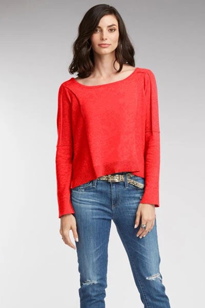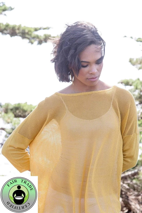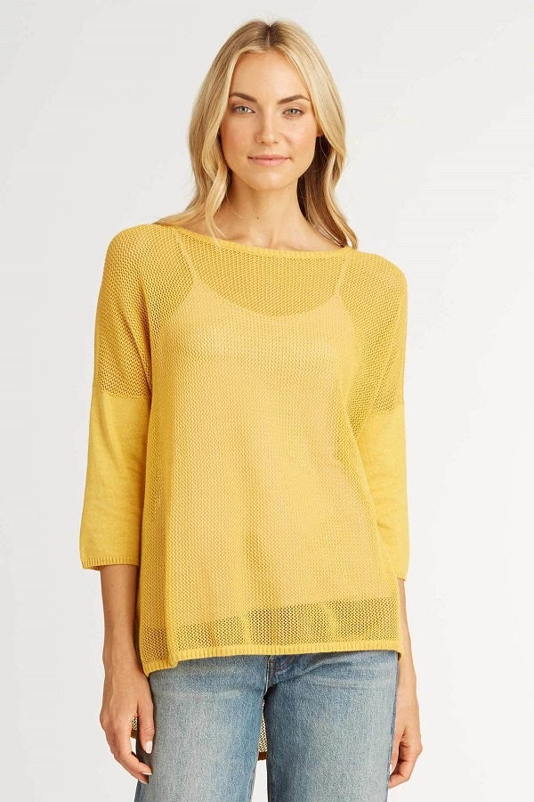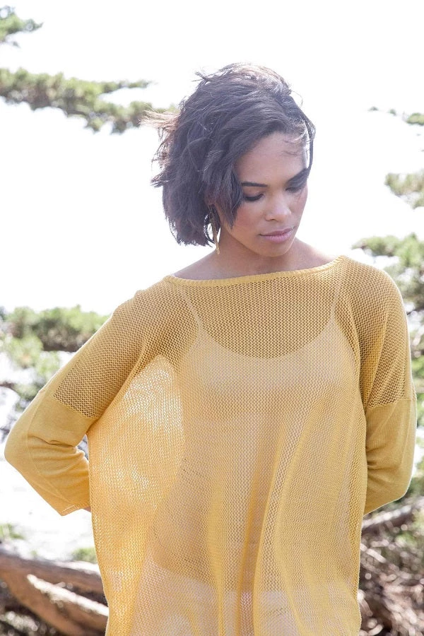 Great transitional sweater for any season. This lightweight organic pullover is soft, sexy and stylish. Open knit relaxed pullover has delicate finishing details for the main body and partially solid knit three-quarter sleeves and slightly lower back.