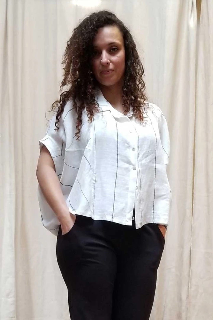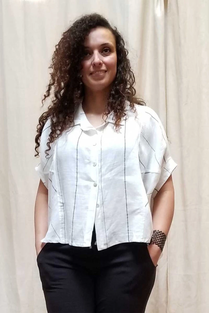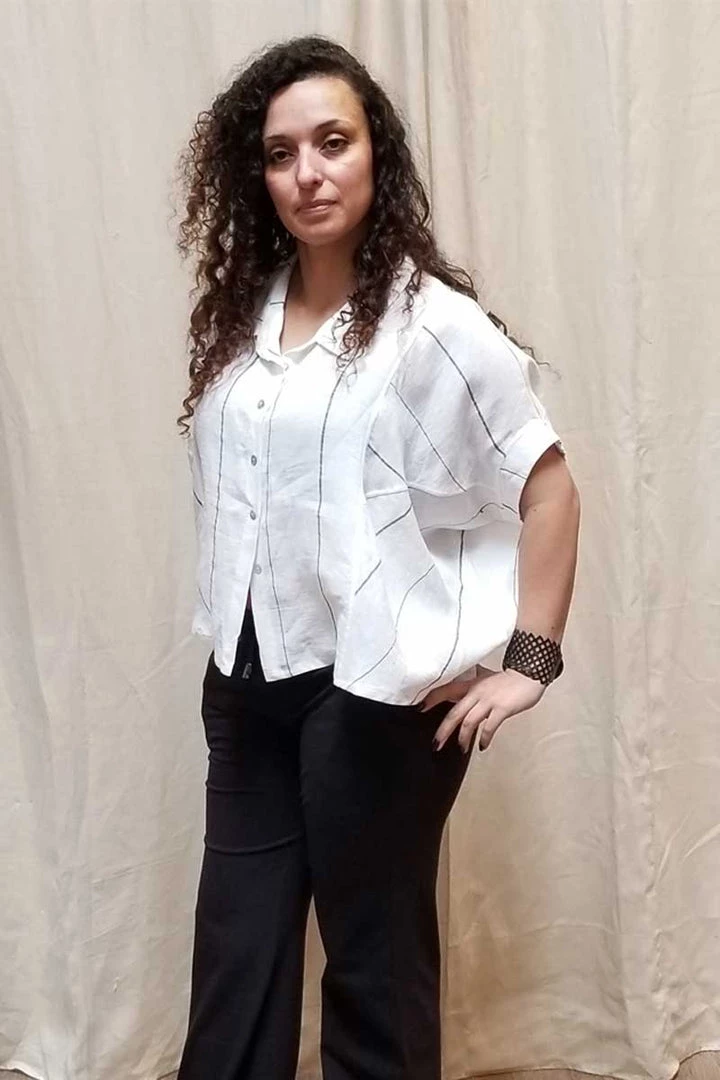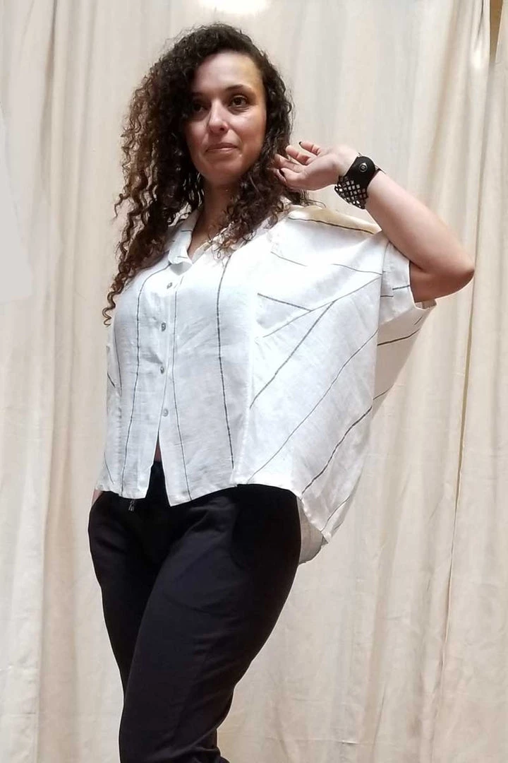 Great loose and roomy Italian linen top with a lot of flair. Nice wide sleeves, great crisp white linen with a narrow dark strip makes it a sharp top for your summer. A shirt-like collar and button-down front. The length is just to the waist which gives this tp good proportions without overwhelming. Great garment for all body types.
