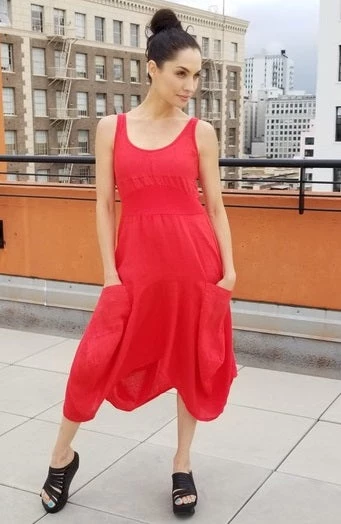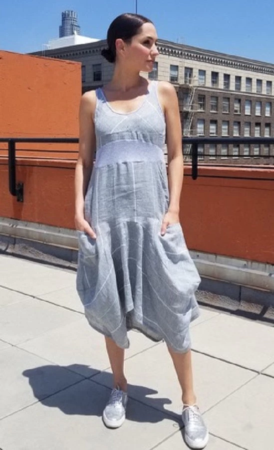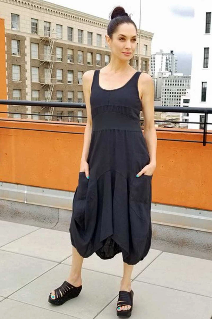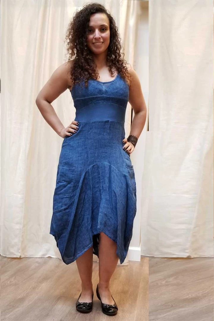 A great style from our favorite Italian linen dressmaker Inizio. Linen doubled skirt with funky puffed style, two generous pockets in front, cotton baby rib top and no sleeves. Gorgeous dress, perfect for all occasions, linen fiber makes it look simple, fun styling makes it special.