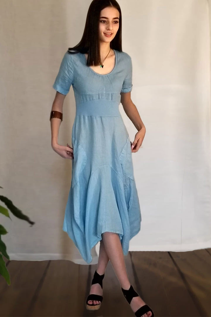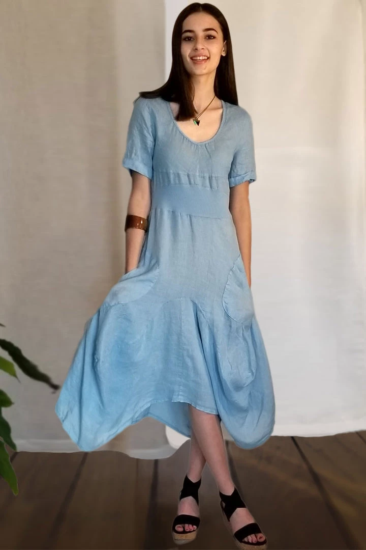 A great style from our favorite Italian linen dressmaker Inizio. Linen doubled skirt with funky puffed style, two generous pockets in front, cotton baby rib top and highly requested short sleeves. Gorgeous dress, perfect for all occasions, linen fiber makes it look simple, fun styling makes it special.