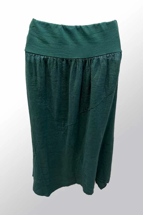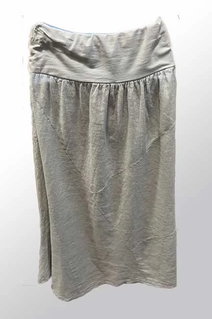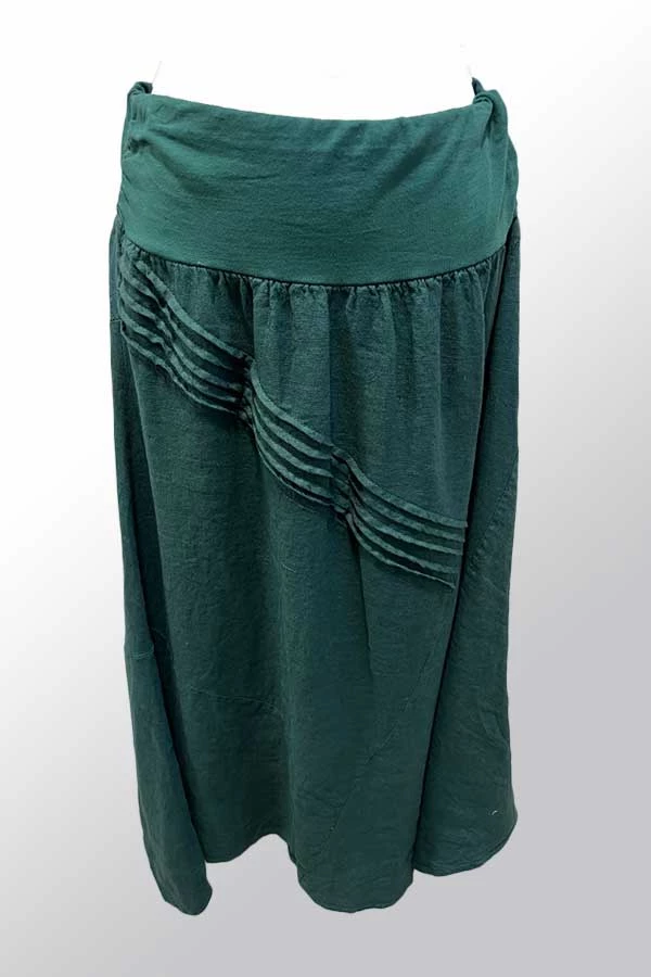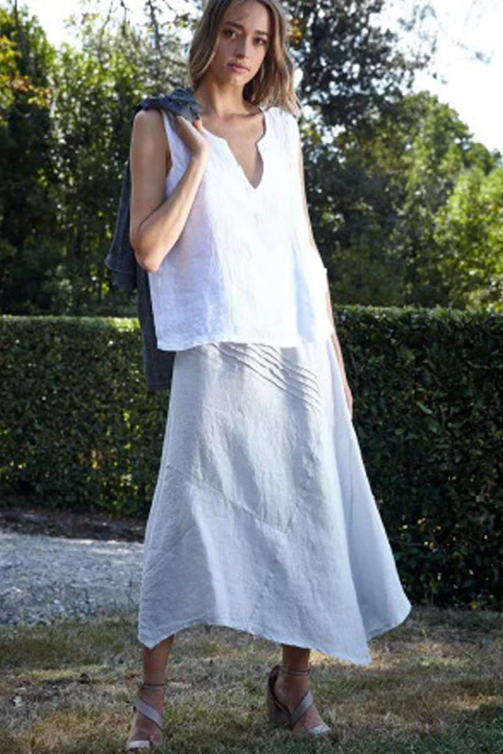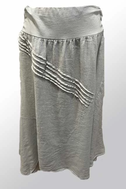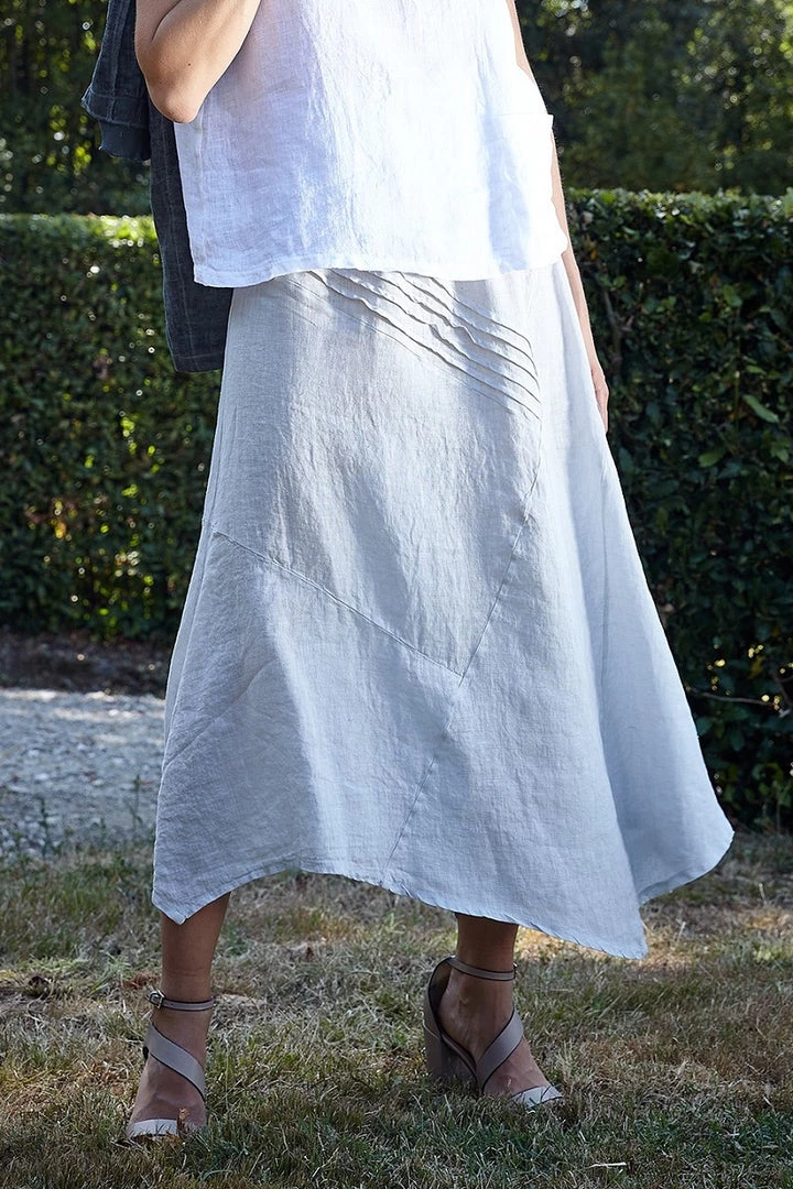 Pretty linen skirt with the same beautiful pleat detail as our Zephyr dress. Beautiful linen, the skirt is a snap to pull on and features beautiful colors. This linen skirt is made by our favorite Italian maker Inizio, famous for linen garments and high-quality craftsmanship. Roomy fit, breezy style, we love it.