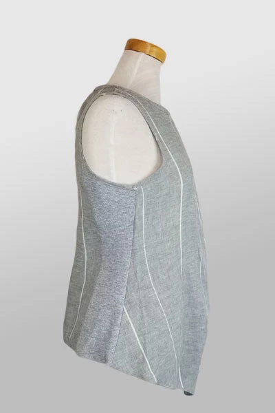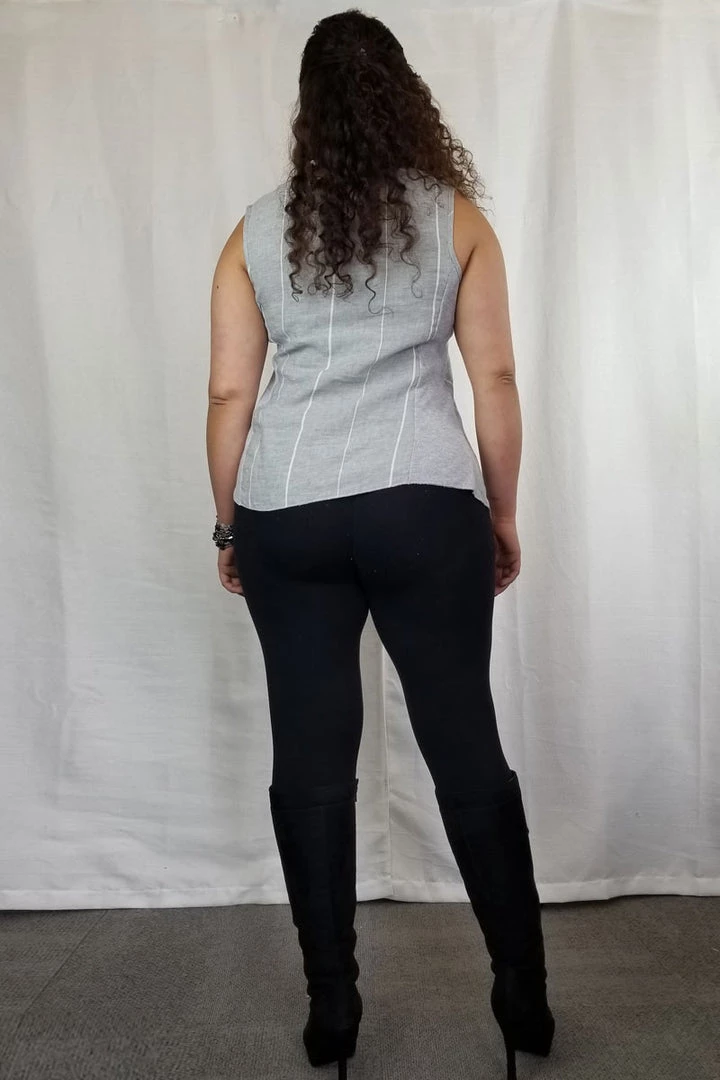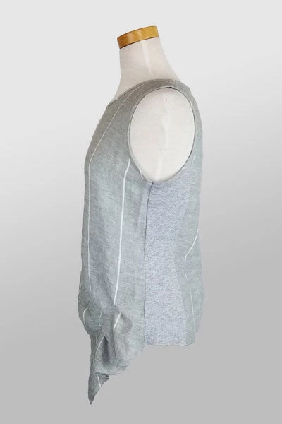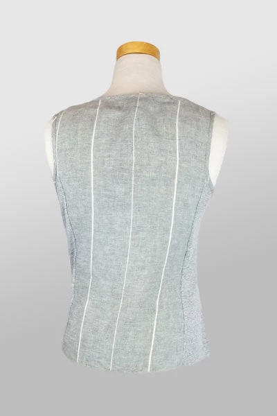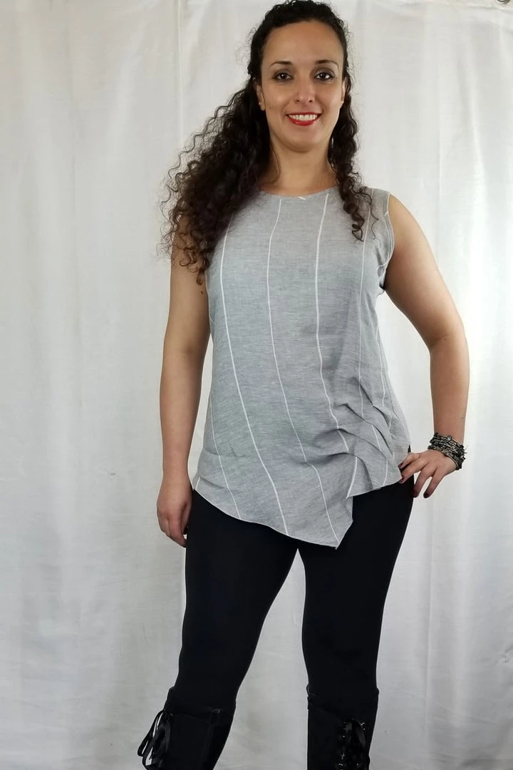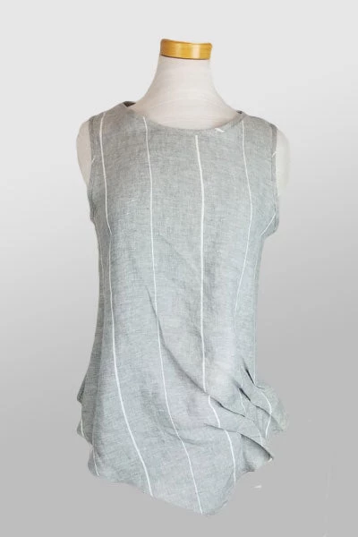 A linen sleeveless top from our favorite Italian brand Inizio. Fabulously striped linen is comfortable and keeps you cool in any weather. This top has a scoop neckline, the side is slightly gathered and the bottom of the blouse is asymmetrically cut in the front, straight in the back. Nice, stylish and very good looking. Light grey background with a white stripe.