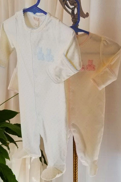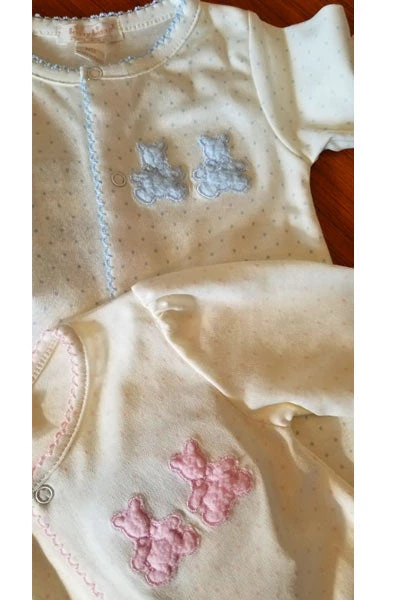 Sweetest footie in the softest organic cotton from Kissy Kissy, famous for the highest quality baby layette clothes. Made of best quality organic Pima cotton, the footie comes in Ecru (Natural) color with the lightest shade of pink or blue dots. On a front there is a set of two mini bears embroidered on a chest in the same color as dots. All edges around the neck and sleeves are finished with a beautiful edging, sleeves feature built-in mittens.