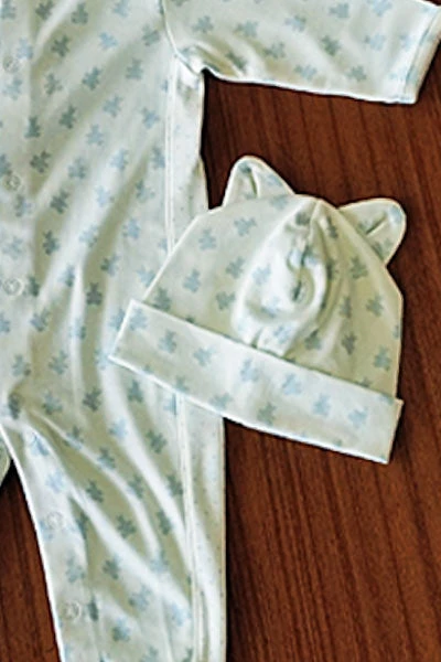Matching hats are available for Newborn and Small sizes. HAT SOLD SEPARATELY. organic-cotton-hat-mini-bear-embroidery