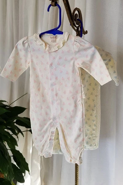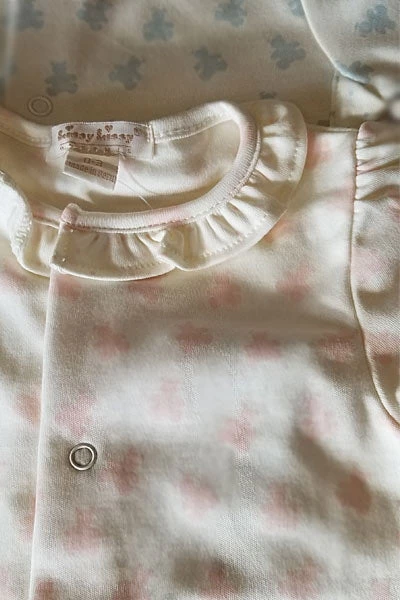 The most adorable playsuit in the softest organic cotton from Kissy Kissy, famous for the highest quality baby layette clothes. Made of best quality organic Pima cotton, the footie comes in Ecru (Natural) color with the lightest shade of pink or blue of beautiful bears pattern.