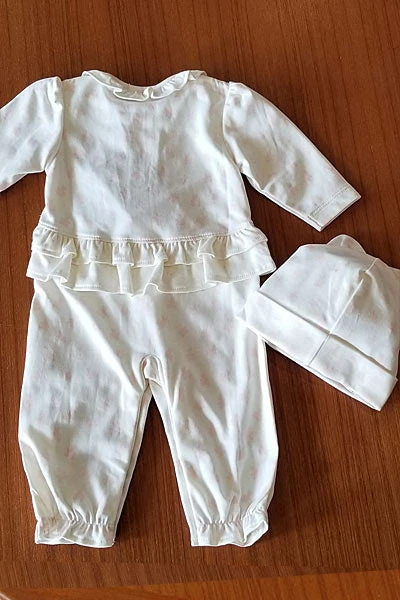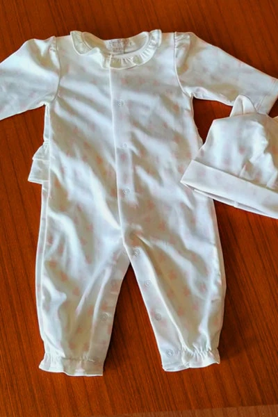 Blue footie has sweet insets on a side in a dotted pattern in the same color. Pink has beautiful gathers at the neck, sleeves, ankles, as well as double ruffles on the backside. All edges are beautifully finished, the quality is truly superb.
