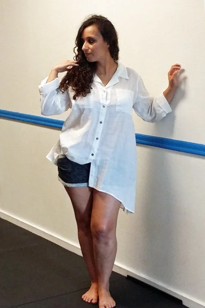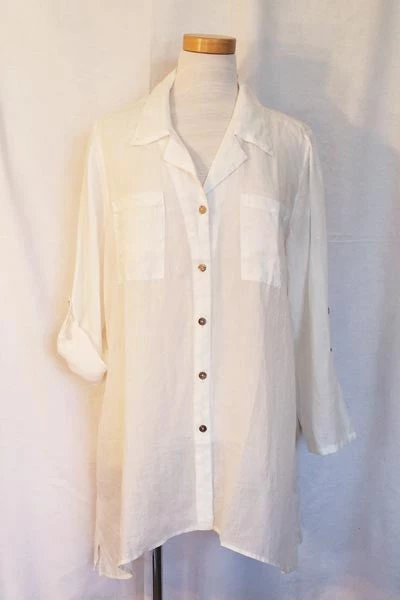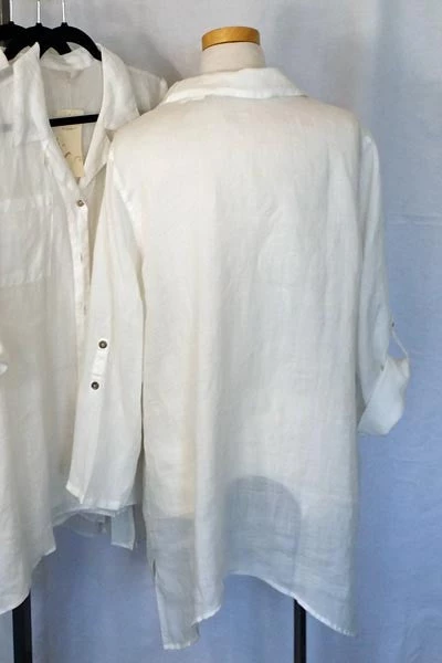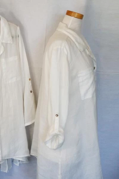 Everybody needs one! Lovely, light as a feather, perfect for summer big white shirt. Very roomy but because ramie can be woven very thinly it does not add bulk to the body, it stays cool even in tropics and looks fabulous.