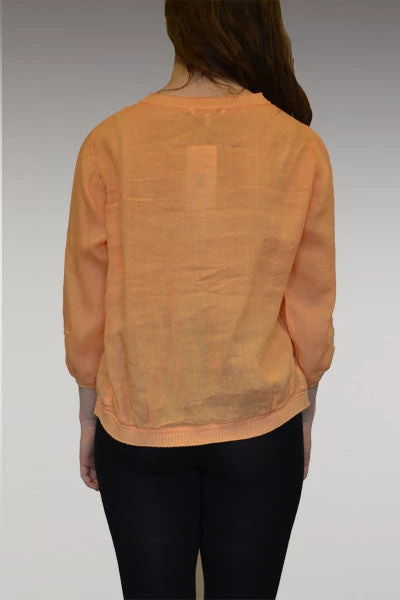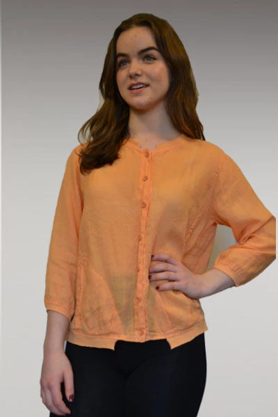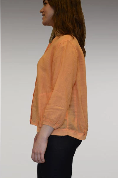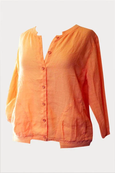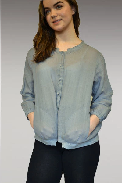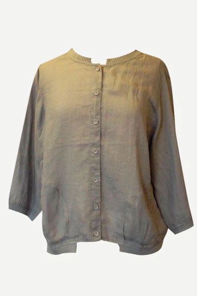 Lovely jacket! Roomy but not long, very light and airy. Perfect cover up without getting hot. Long sleeve, buttoned in front, two side pockets. Sweet ribbed finish at the top, bottom, and sleeves. Nice loose cut. Cute!