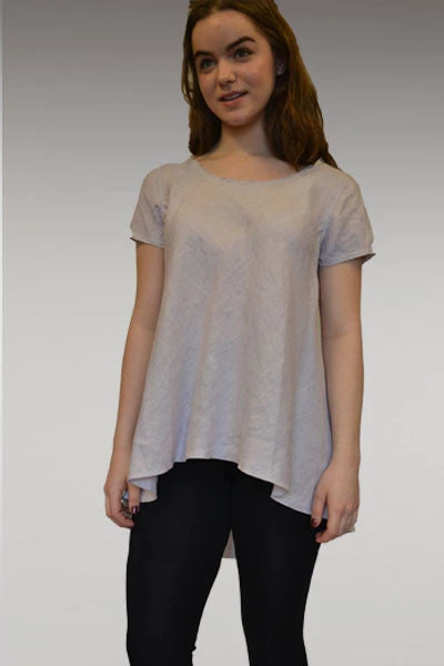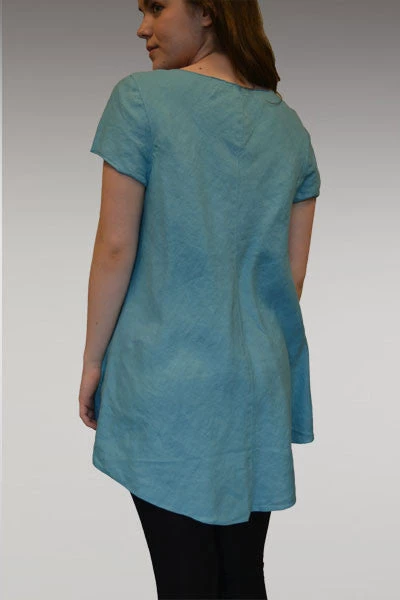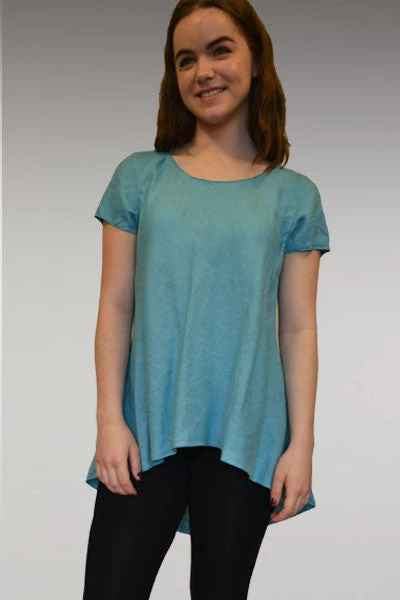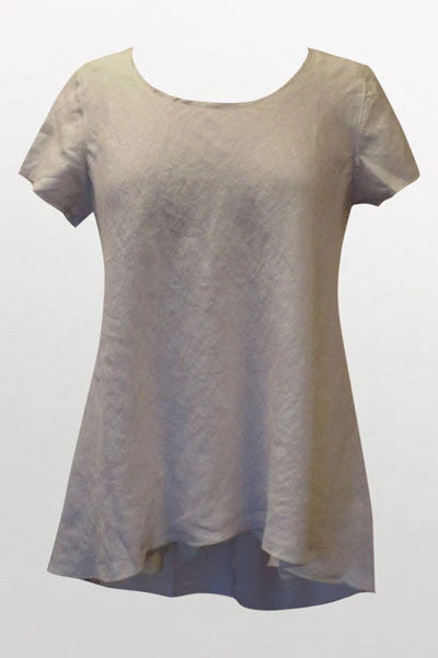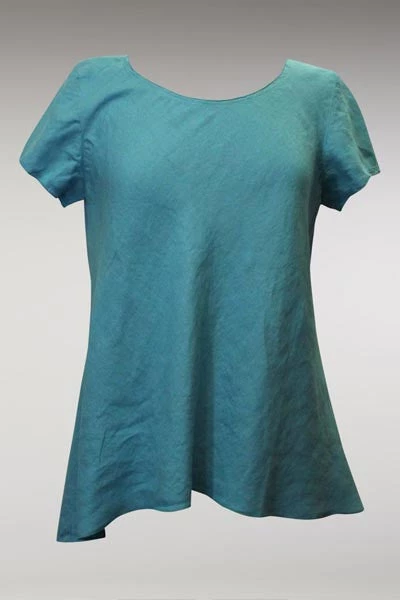 Perfect. Perfect medium weight linen tee (not see through). Short sleeves, fabulous flared body, good medium length in front (26″ in front from shoulder for Small), perfect longer length in back (30-33″).Â