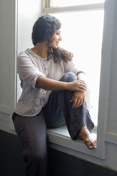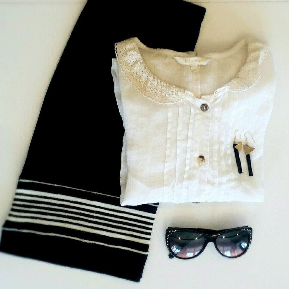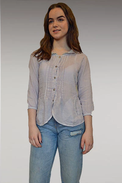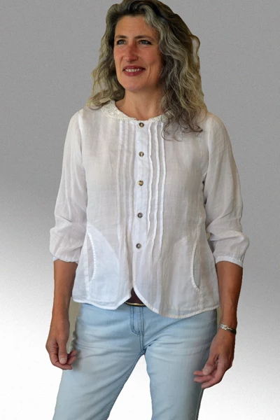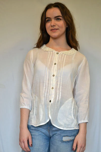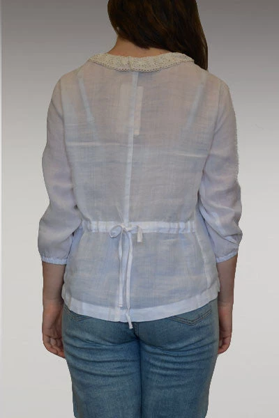 This is such a beautiful garment in multitude of colors. Sweet blouse with retro lace collar, beautiful detailing in a front with nice buttons. There is a tie in a back that allows you to cinch the garment in a waist or leave it relaxed. 3/4 sleeves. This top has quite loose fit so it can be worn over the camisole like a super light jacket or by itself. It’s delightful.