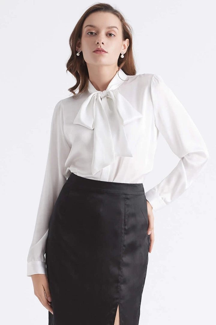 Gorgeous, elegant 100% silk blouse in beautiful colors. This blouse features a long tie that can be worn gently folded over or tied in a bow. Long sleeves with buttoned faux pearl oversized cuffs. The blouse has a smooth texture and extra charmeuse silk sheen allowing extra light to your face – sophisticated and beautiful. True to size fit.