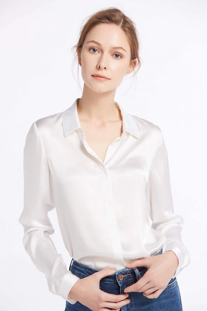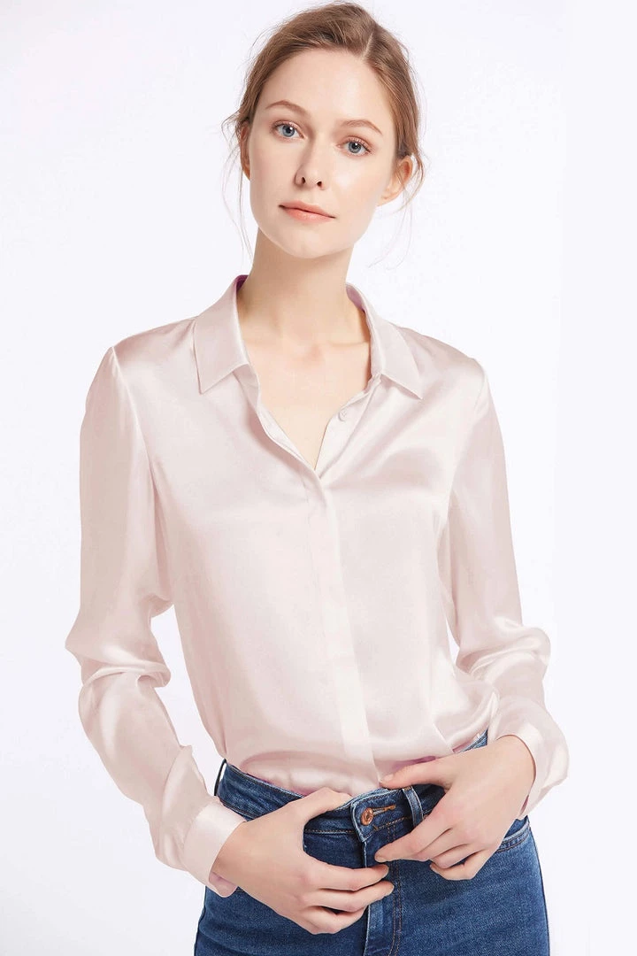 Smooth, luxurious, gorgeous 100% silk blouse in beautiful colors. It goes well with every combination – work, evening, even jeans. Adds lightness and sophistication to your wardrobe. The button-down front is covered with a smooth placket. Long sleeves with buttoned faux pearl oversized cuffs, the bottom is slightly curved. The blouse has a smooth texture and extra charmeuse silk sheen allowing extra light to your face – sophisticated and beautiful. True to size fit.