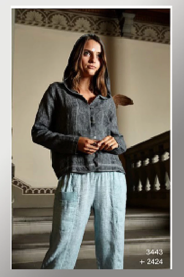 Beautiful garment made of Italian linen by Inizio. Long sleeves with nicely crafted 4″ flat cuff and opening. The front is beautifully detailed with a row of wood buttons and old-fashioned loops, as well as additional seams for a great fit. Linen textile is light in weight so this garment can be worn as shirt or a jacket. Fabulous. This top has a cotton rib inset on the sides for a better fit and flexibility. Two front in-seam flat pockets. Casual yet elegant – very much on-trend.