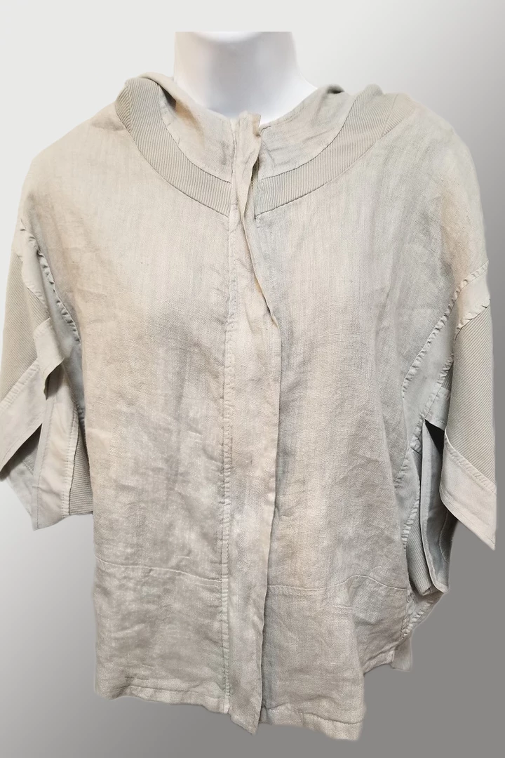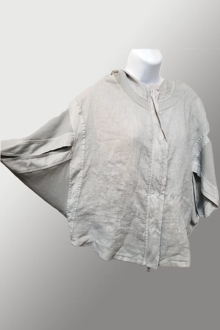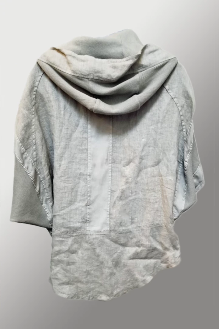 Great hoodie, different and unorthodox with mix of textures of linen and ribbed cotton. Zipped front, half-length cape type opening for sleeves, ribbed cotton hoodie finished in wide trim of linen. Taped sides, no pockets. Fun, interesting, something quite different. We love it!