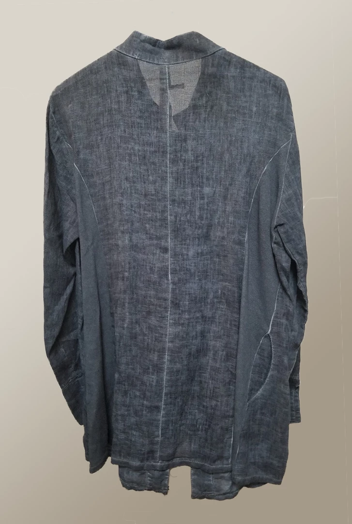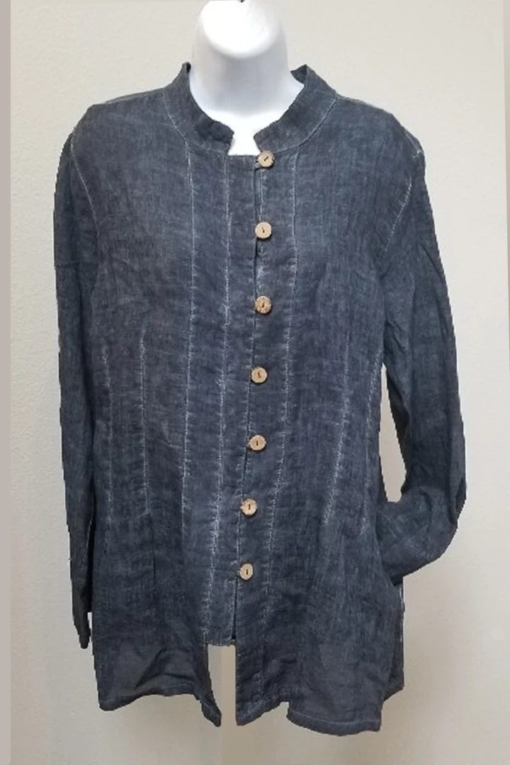 Beautiful garment made of Italian linen by Inizio. Long sleeves with nicely crafted 4″ flat cuff and opening. The front is beautifully detailed with a row of wood buttons and old-fashioned loops, as well as additional seams for a great fit. Linen textile is light in weight so this garment can be worn as shirt or a jacket. Fabulous. This top has a cotton rib inset on the sides for a better fit and flexibility. Two front in-seam flat pockets. Casual yet elegant – very much on-trend.