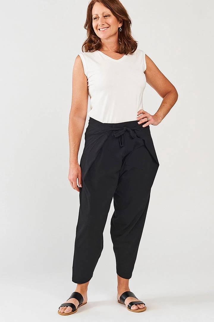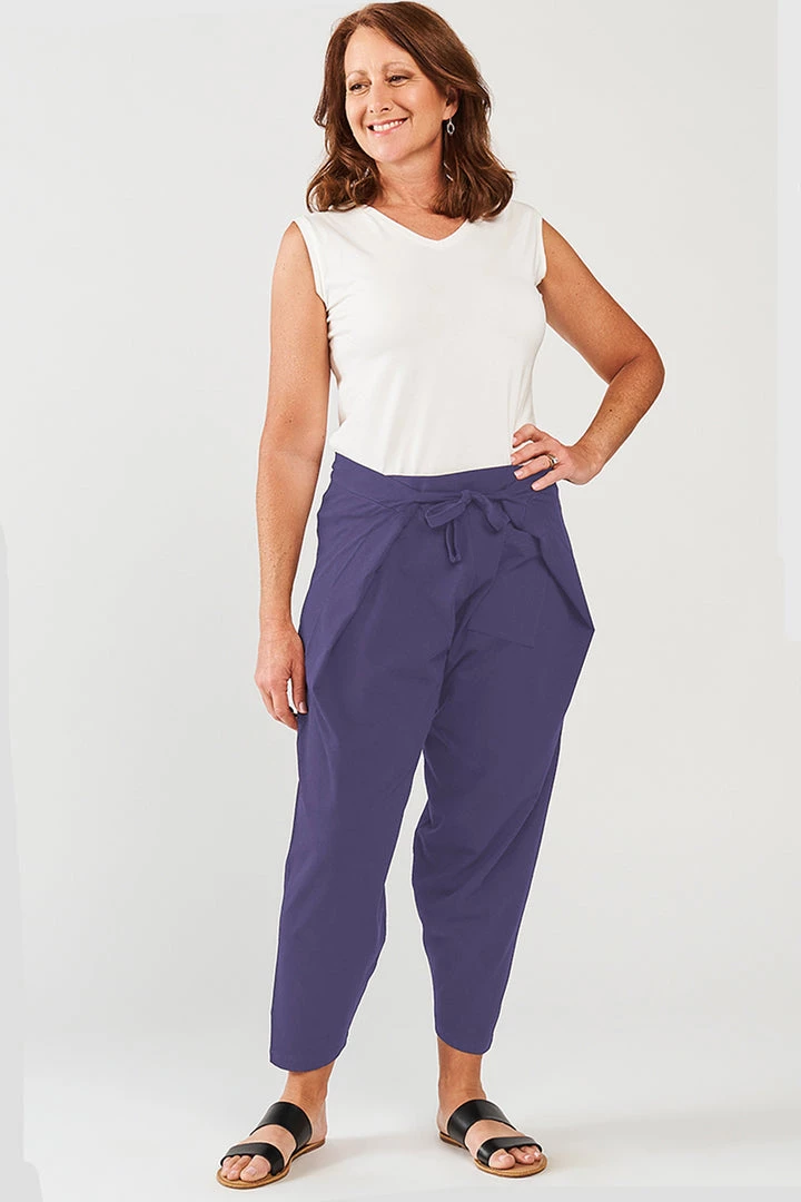 These certified organic cotton pants are the most comfortable pants ever. Just like “harem” pants, these have a very wide waist with ties, which you can tie in the way that is most comfortable for you. The legs are nice and roomy with a relaxed fit, narrowing towards the ankles. The pants even have a patch pocket in the front. These pants look great, and are light and comfy – they may become your favorite garment!