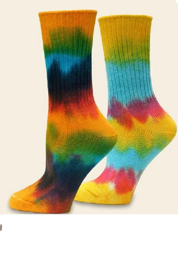 These certified organic cotton crew socks are tie-dyed by hand. Each sock has its own unique look after being dyed- no two pairs are alike, available for both women and men.Â