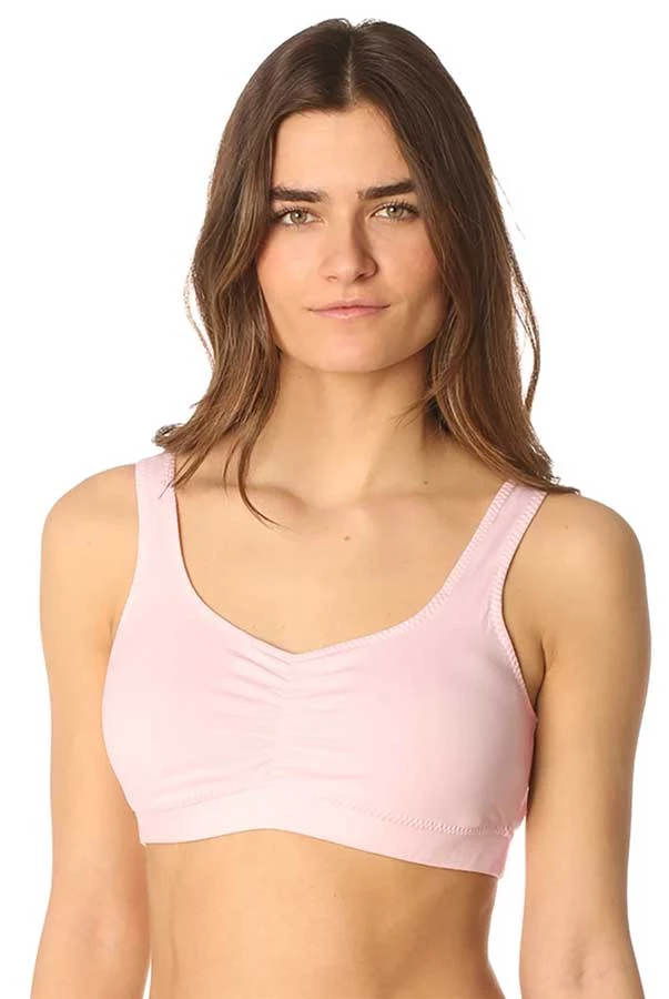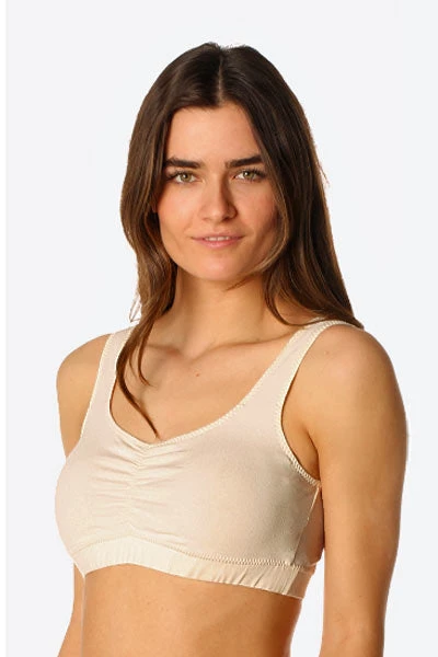 An organic cotton bra that is certified, made in the U.S.A., and one of the most comfortable bras ever. Full coverage cut, shaping center-ruching, and straight straps. Made with undyed soft organic cotton with a modal lining at the pads to wick moisture away from your body. This bra features a racerback style and a double-thick 1″ wide fabric band on the bottom for much support.Â