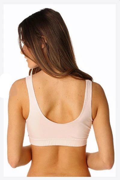 This bra has insertable pads (included) which you can use or not. You can add your own nursing breast pads or mastectomy breast form. Also a great nursing bra. No black closure, you put it on through your shoulders. Runs a bit on a small side.